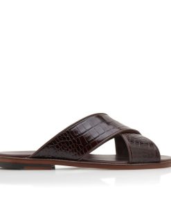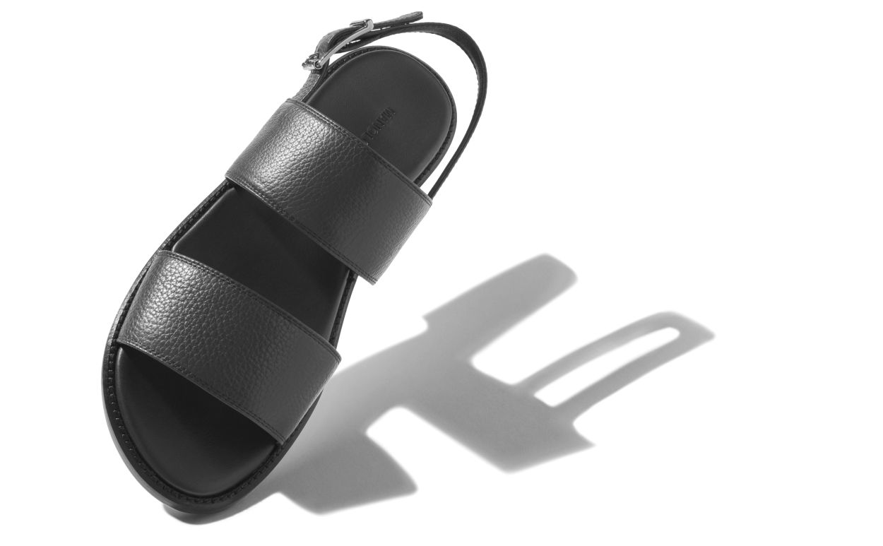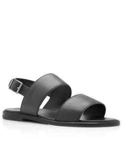 Black calf leather sandals featuring two broad straps across the toes and instep and adjustable ankle strap with silver finish buckle. Upper: 100% calf leather. Sole: 100% calf leather. Lining: 100% calf leather. Heel measures 10 mm. Made in Italy.