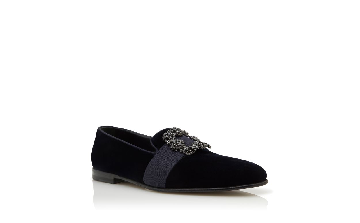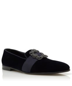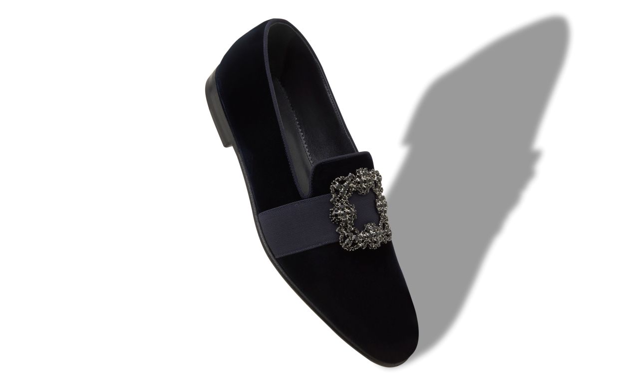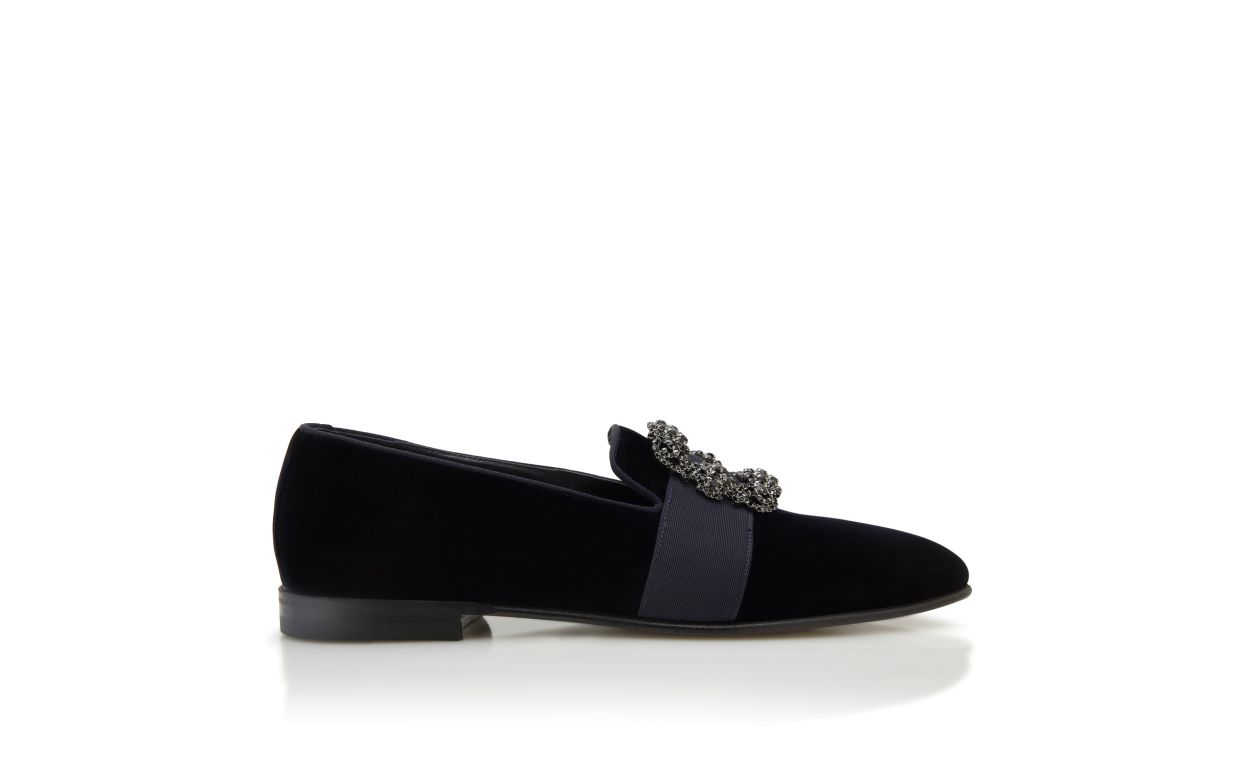 Dark blue velvet loafers featuring grosgrain ribbon and trim with a square crystal buckle.Upper: 75% velvet, 15% viscose, 10% textile. Sole: 100% calf leather. Lining: 100% kid leather. Heel measures 10 mm. UK sizing. Made in Italy.