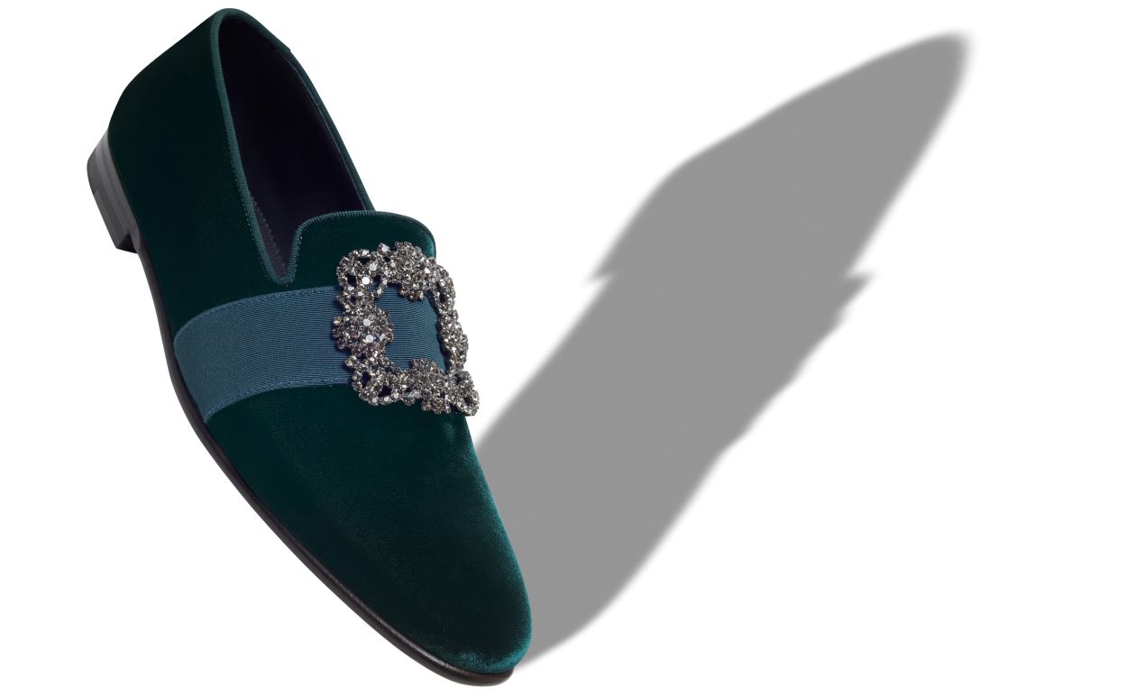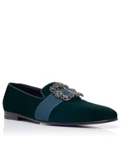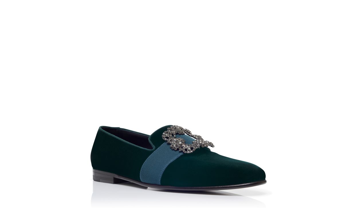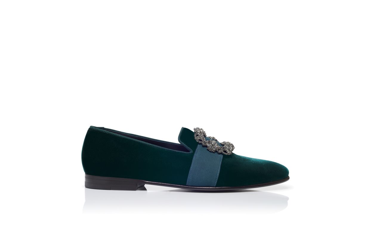 Green velvet loafers featuring grosgrain ribbon and square crystal buckle.Upper: 75% velvet, 15% viscose, 10% fabric. Sole: 95% calf leather, 5% rubber. Lining: 100% calf leather. Heel measures 10 mm. UK sizing. Made in Italy.