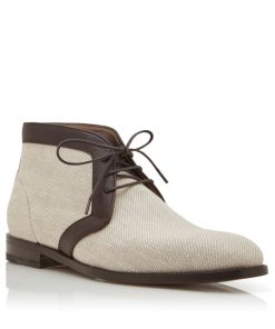 Cream linen ankle boots featuring black calf leather design details, lace-up closure and flat black rubber sole.Upper: 90% linen, 10% calf leather. Sole: 95% calf leather, 5% rubber. Lining: 100% calf leather.Heel measures 10 mm.UK sizing.Made in Italy.