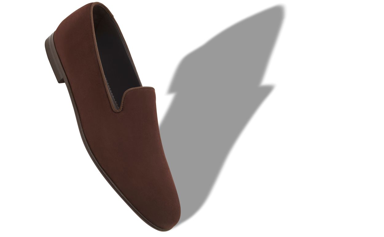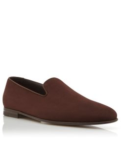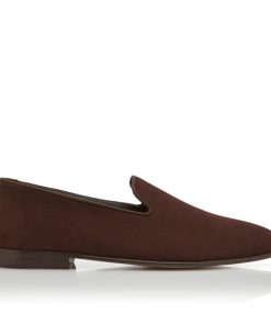Dark brown suede loafers featuring tonal grosgrain piping. Upper: 90% kid suede, 10% fabric. Sole: 100% calf leather. Lining: 100% kid leather. Heel measures 10 mm. UK sizing. Made in Italy.