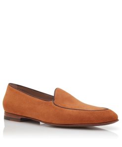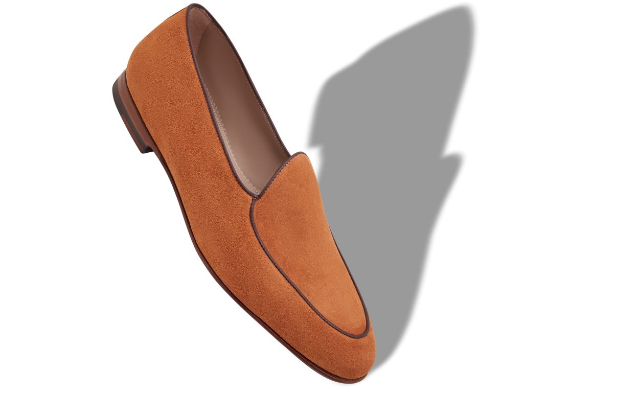 Orange suede loafers featuring leather edging details and apron cut design.Upper: 100% calf suede. Sole: 95% calf leather, 5% rubber. Lining: 100% calf leather.Heel measures 10 mm.UK sizing.Made in Italy.