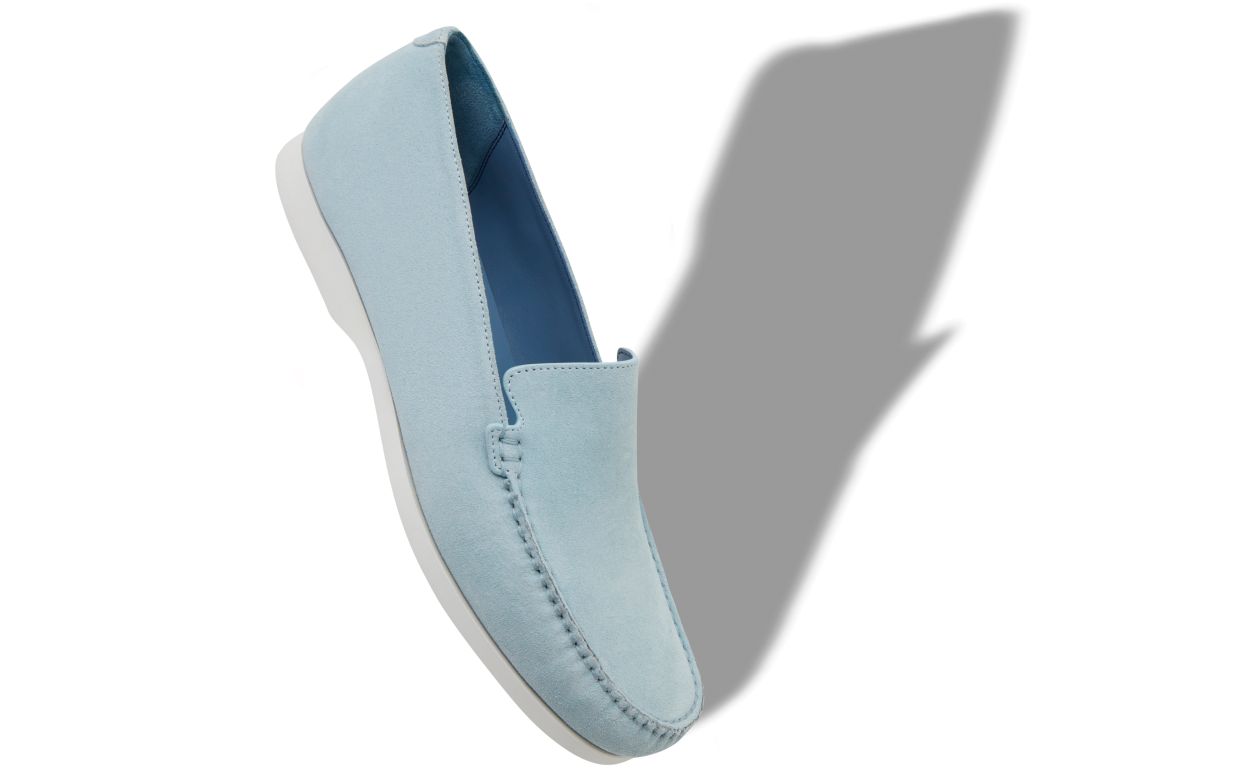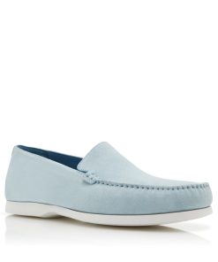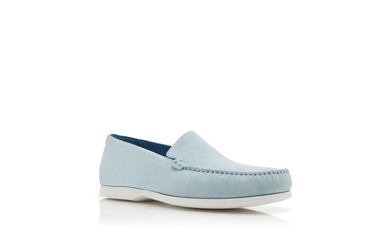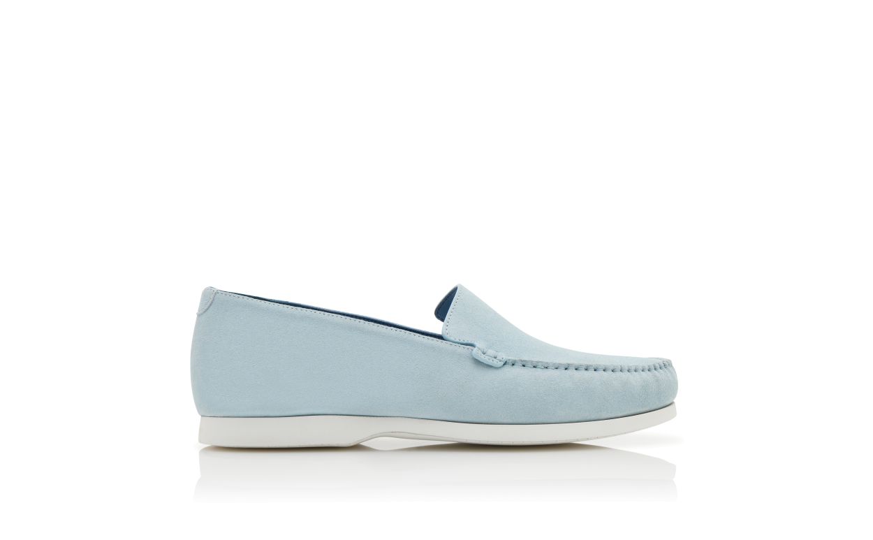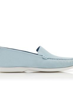 Light blue suede boat shoes featuring apron cut design and stitch detail. Finished with white rubber sole.Upper: 100% calf suede. Sole: 100% rubber. Lining: 100% calf leather. Heel measures 10 mm. UK sizing. Made in Italy.