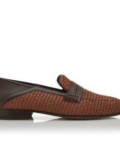 Dark brown raffia penny loafers featuring decorative penny keeper and tonal calf leather counter. Upper: 80% raffia, 20% calf leather. Sole: 100% calf leather. Lining: 100% calf leather.Heel measures 10 mm.UK sizing.Made in Italy.