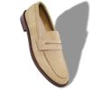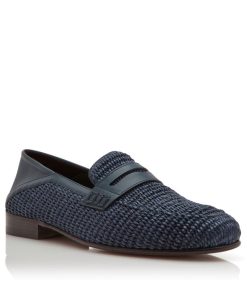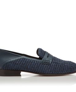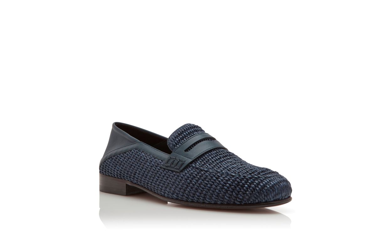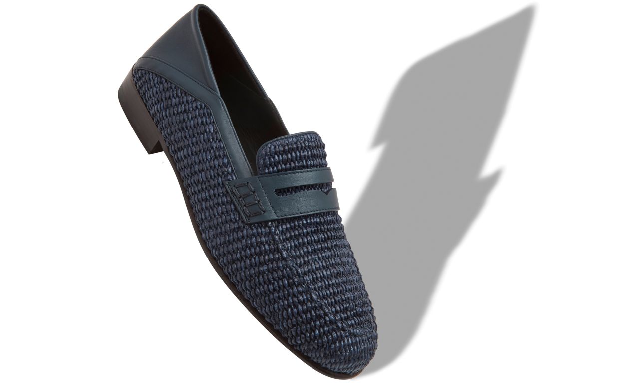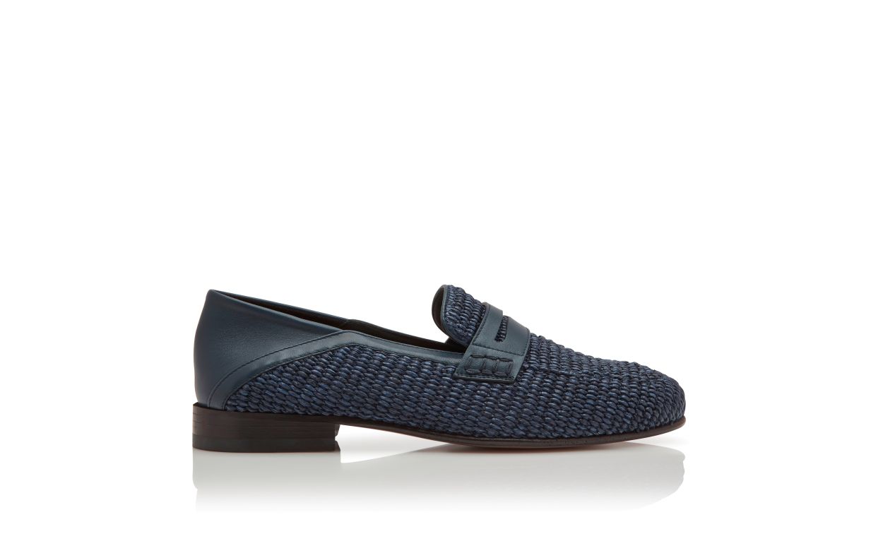 Navy blue raffia penny loafers featuring decorative penny keeper and tonal calf leather counter. Upper: 80% raffia, 20% calf leather. Sole: 100% calf leather. Lining: 100% calf leather.Heel measures 10 mm.UK sizing.Made in Italy.