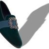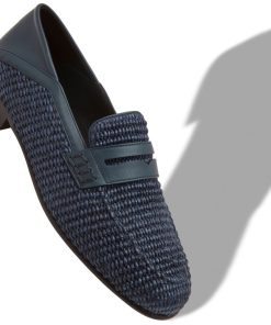 Navy blue raffia penny loafers featuring decorative penny keeper and tonal calf leather counter. Upper: 80% raffia, 20% calf leather. Sole: 100% calf leather. Lining: 100% calf leather.Heel measures 10 mm.UK sizing.Made in Italy.