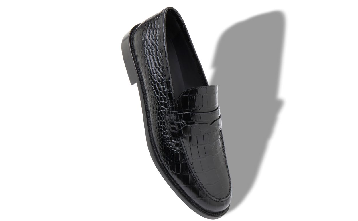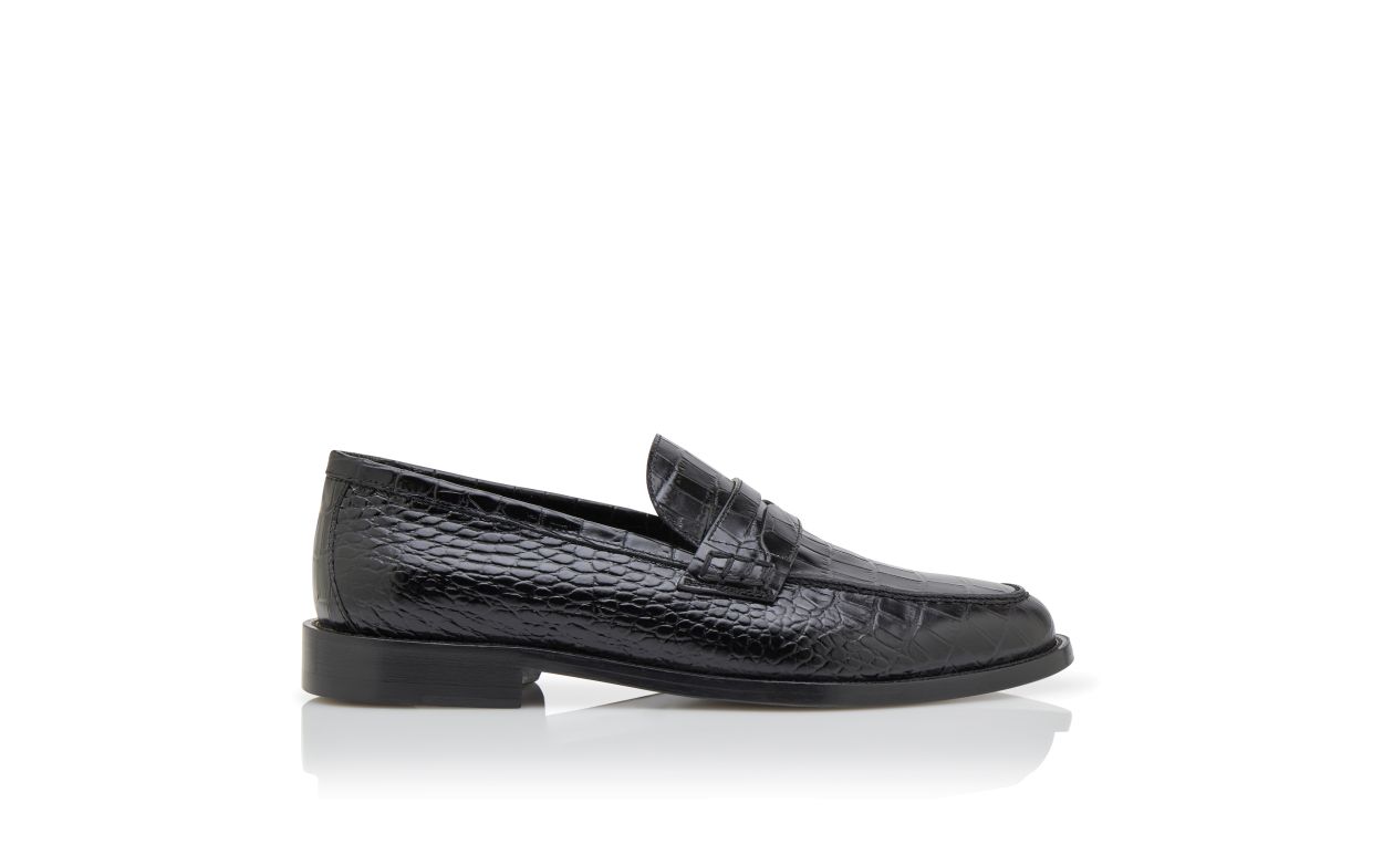 Black calf leather penny loafers featuring crocodile design, apron cut styling and decorative penny keeper with stitch detail.Upper: 100% calf leather. Sole: 95% calf leather, 5% rubber. Lining: 100% calf leather. Heel measures 10 mm. UK sizing. Made in Italy.
