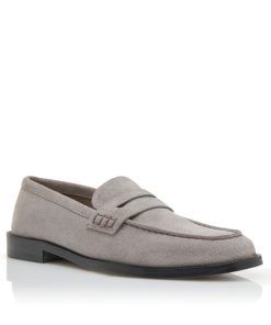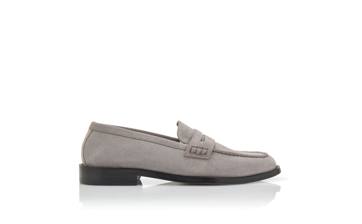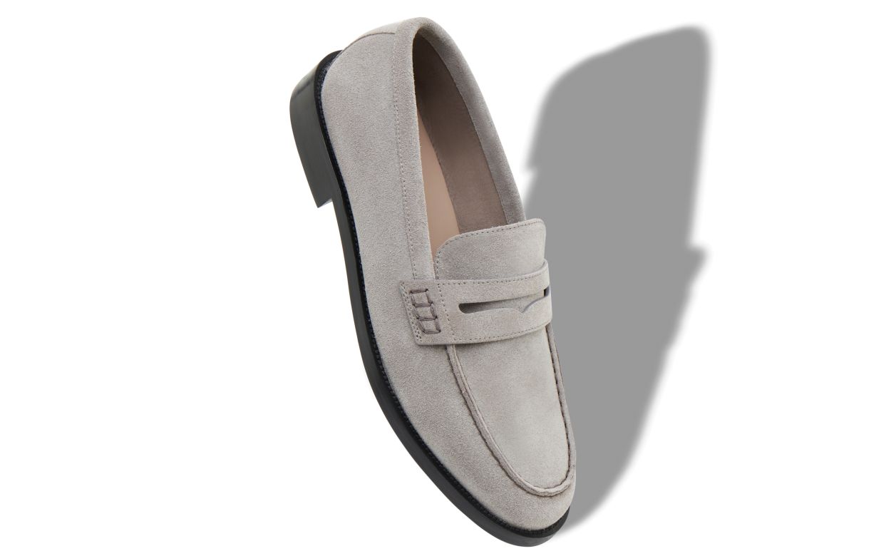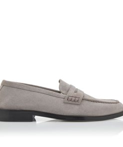 Grey suede penny loafers featuring apron cut design and decorative penny keeper with stitch detail.Upper: 100% calf suede. Sole: 95% calf leather, 5% rubber. Lining: Unlined. Heel measures 10 mm. UK sizing. Made in Italy.