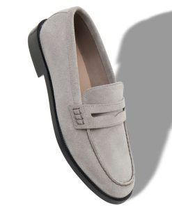 Grey suede penny loafers featuring apron cut design and decorative penny keeper with stitch detail.Upper: 100% calf suede. Sole: 95% calf leather, 5% rubber. Lining: Unlined. Heel measures 10 mm. UK sizing. Made in Italy.
