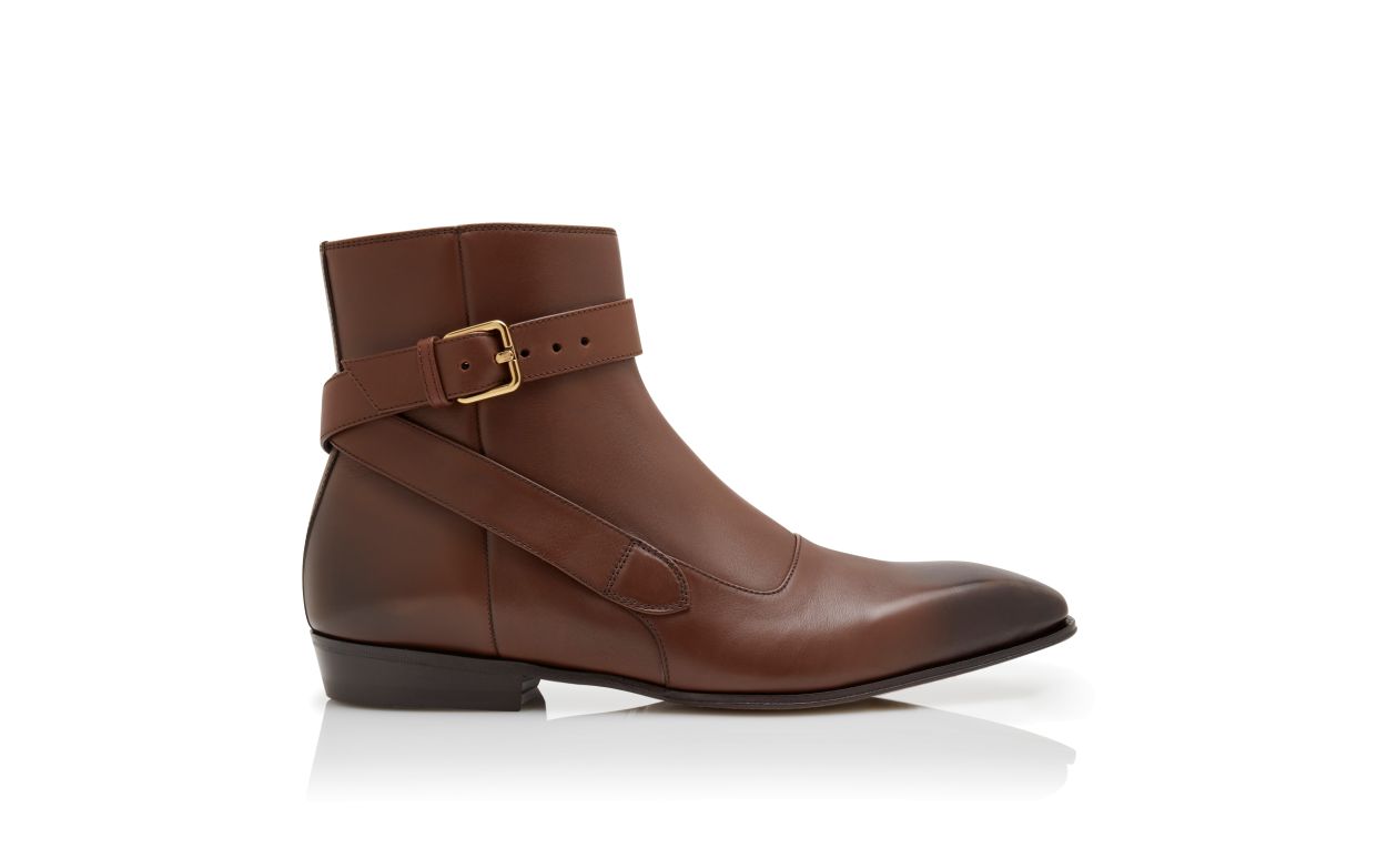 Brown calf leather ankle boots featuring gold buckle design detail and side zip closure. Upper: 100% calf leather. Sole: 95% calf leather, 5% rubber. Lining: 100% calf leather. Heel measures 10 mm. UK sizing. Made in Italy.