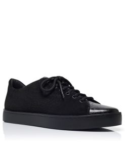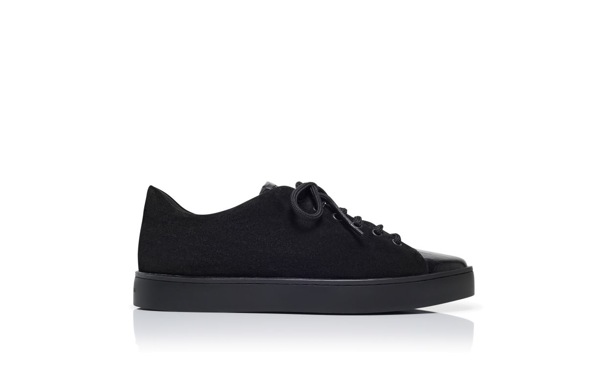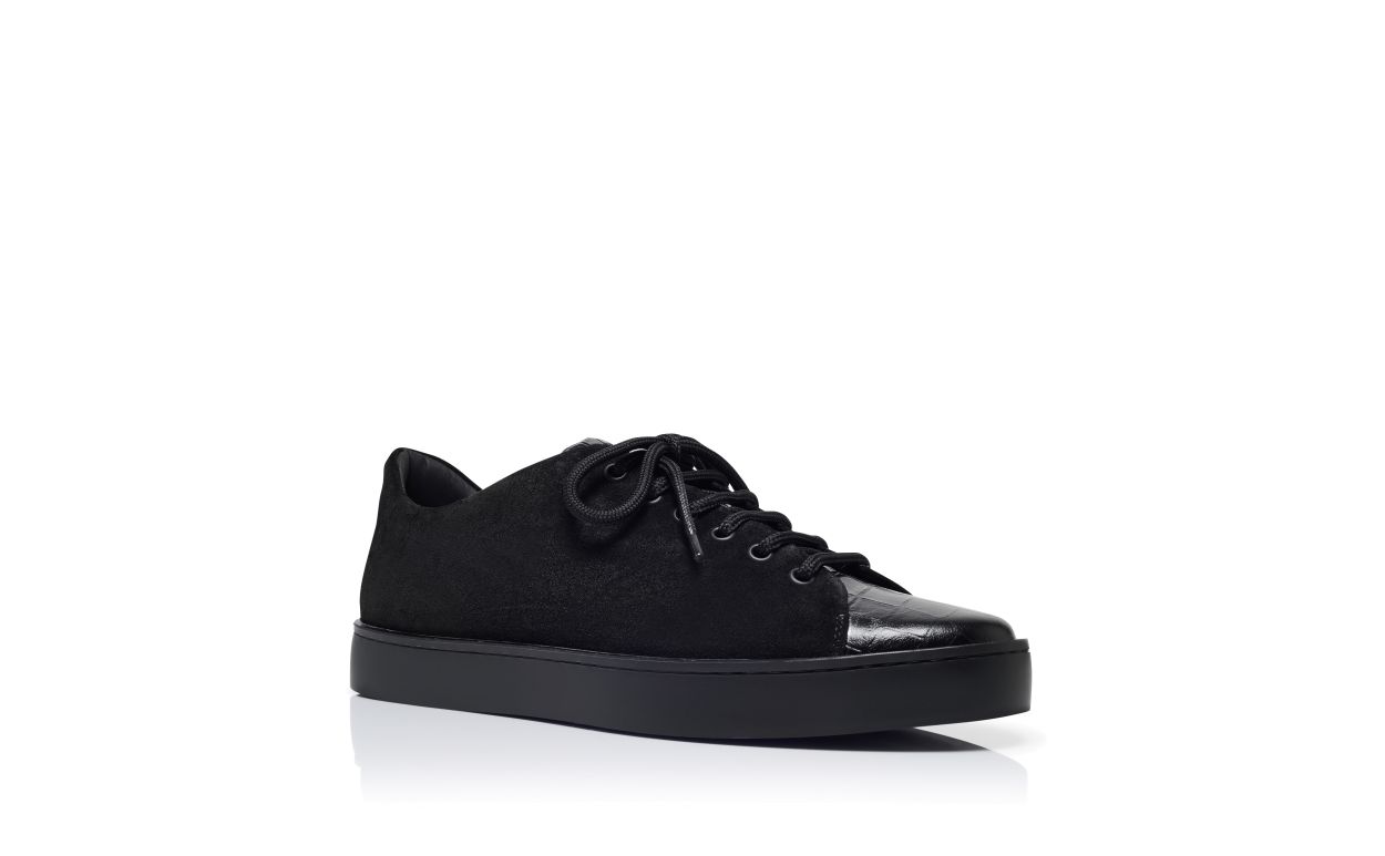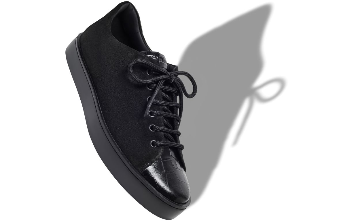 Black suede sneakers featuring low cut design, black laces with eyelets and tonal calf leather crocodile design. Finished with black rubber sole. Upper: 50% calf leather, 50% calf suede. Sole: 100% rubber. Lining: 100% calf leather. Heel measures 10 mm. UK sizing. Made in Italy.