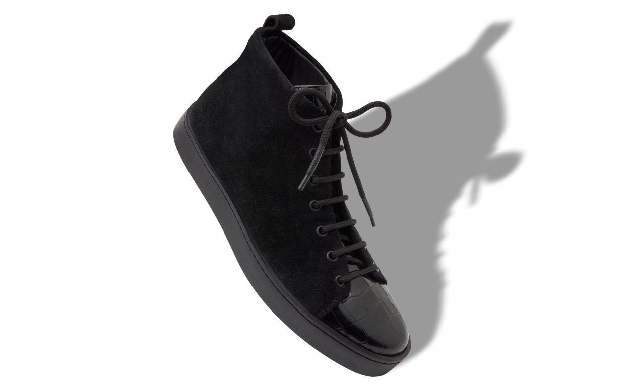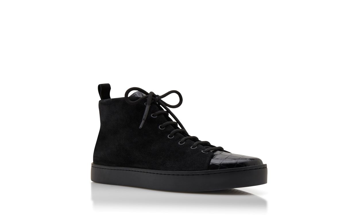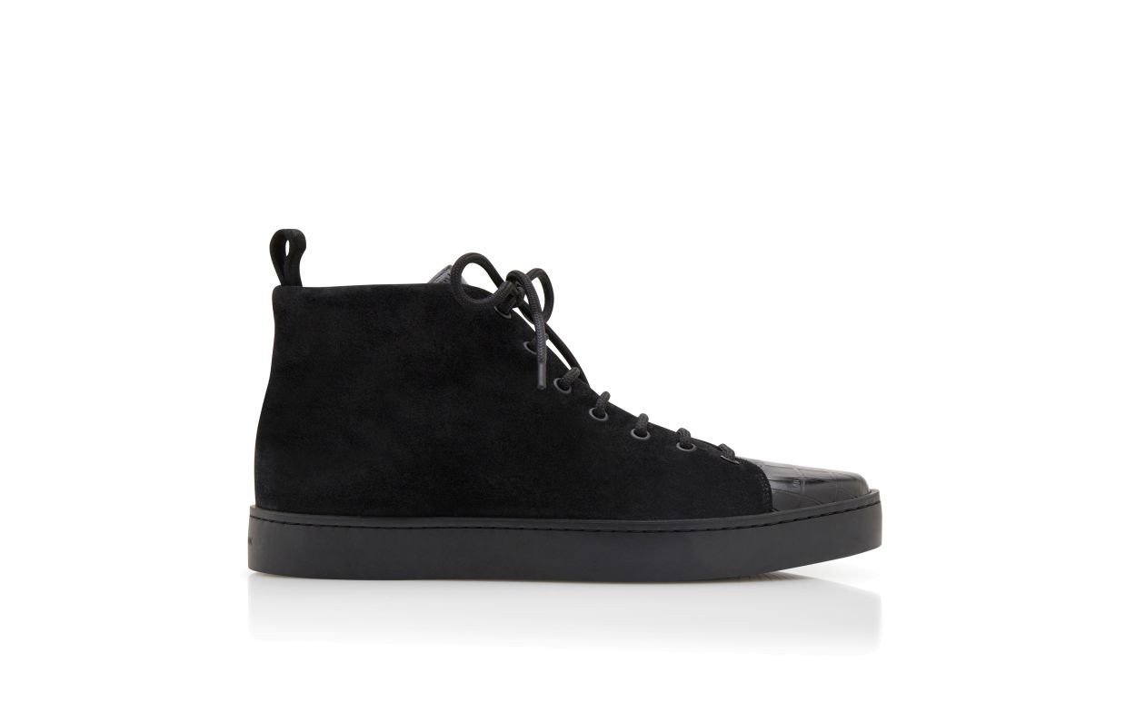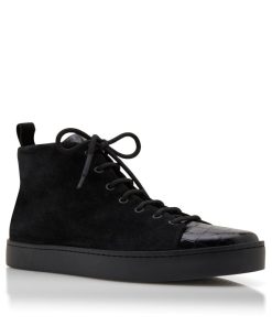 Black calf leather lace up sneakers featuring high top design, rear pull tab and animal print design. Finished with white rubber sole.Upper: 100% calf leather. Sole: 100% rubber. Lining: 100% calf leather. Heel measures 10 mm UK sizing. Made in Italy.