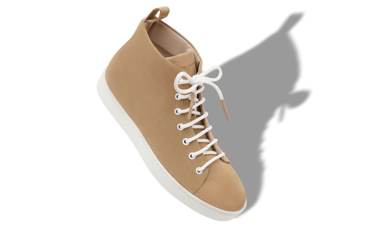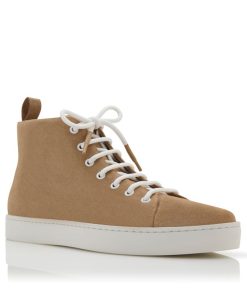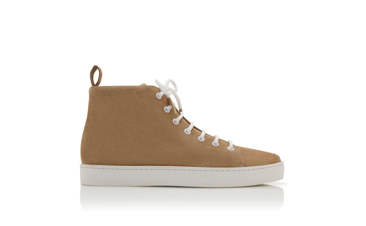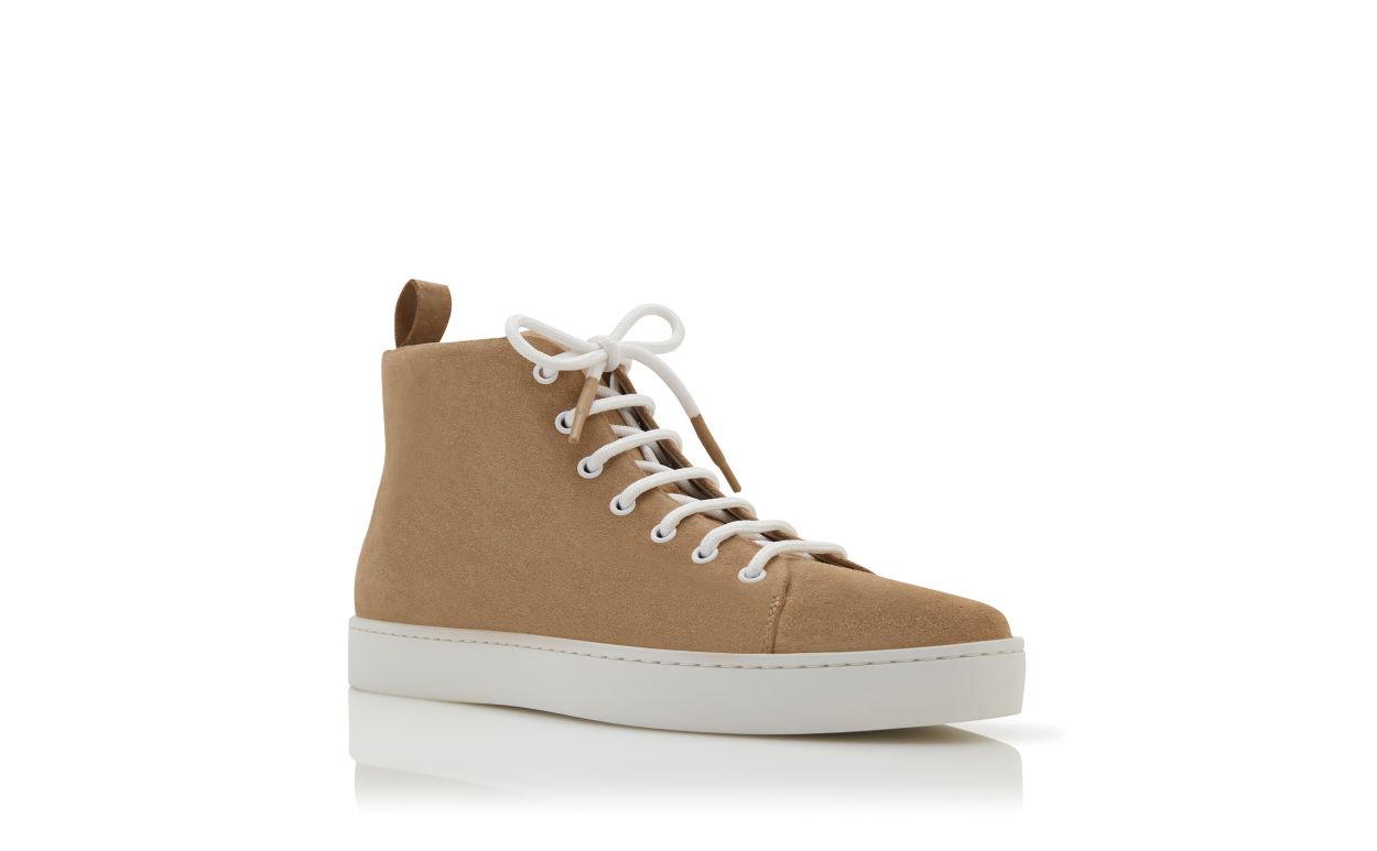 Light brown suede lace-up sneakers featuring high top design, rear pull tab and contrast white laces with light brown lace tips. Finished with white rubber sole.Upper: 100% calf suede. Sole: 100% rubber. Lining: 100% calf leather. Heel measures 10 mm. UK sizing. Made in Italy.