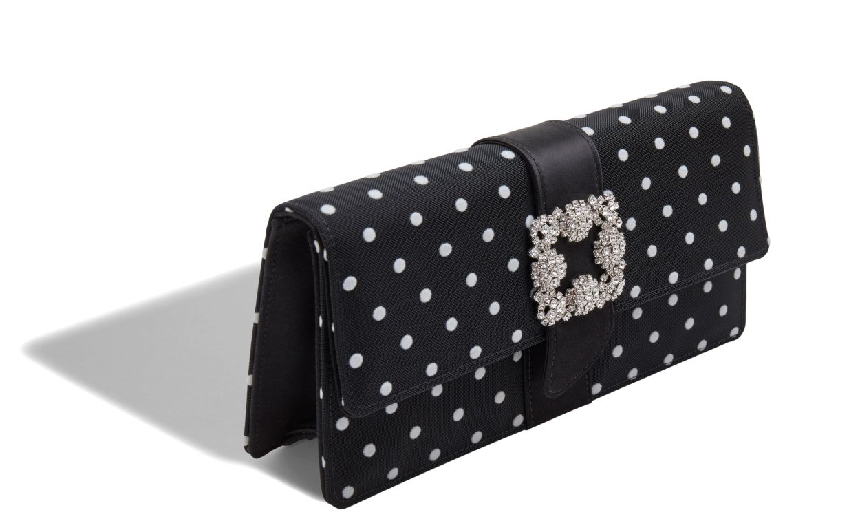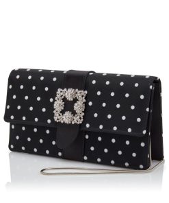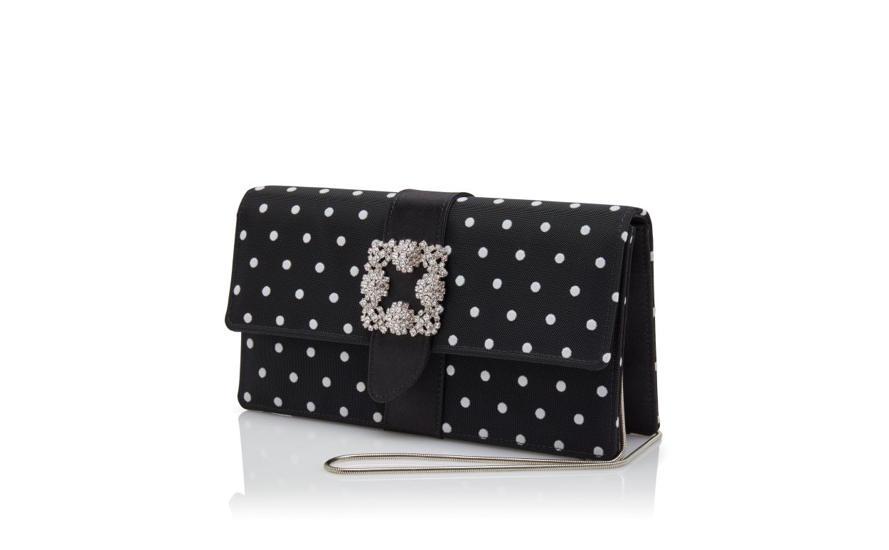 Black satin rectangular clutch bag featuring white polka dot design, flap over detail and jewel clear crystal buckle. Contains internal compartment, mirror and removable chains with two length options. Magnetic closure. Upper: 80% satin, 20% fabric. Lining: 72% viscose, 28% silk. Made in Italy. Height: 12 cm Length: 24 cm Width: 6 cm. Straps measure 37 cm and 110 cm.