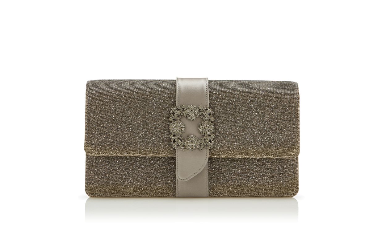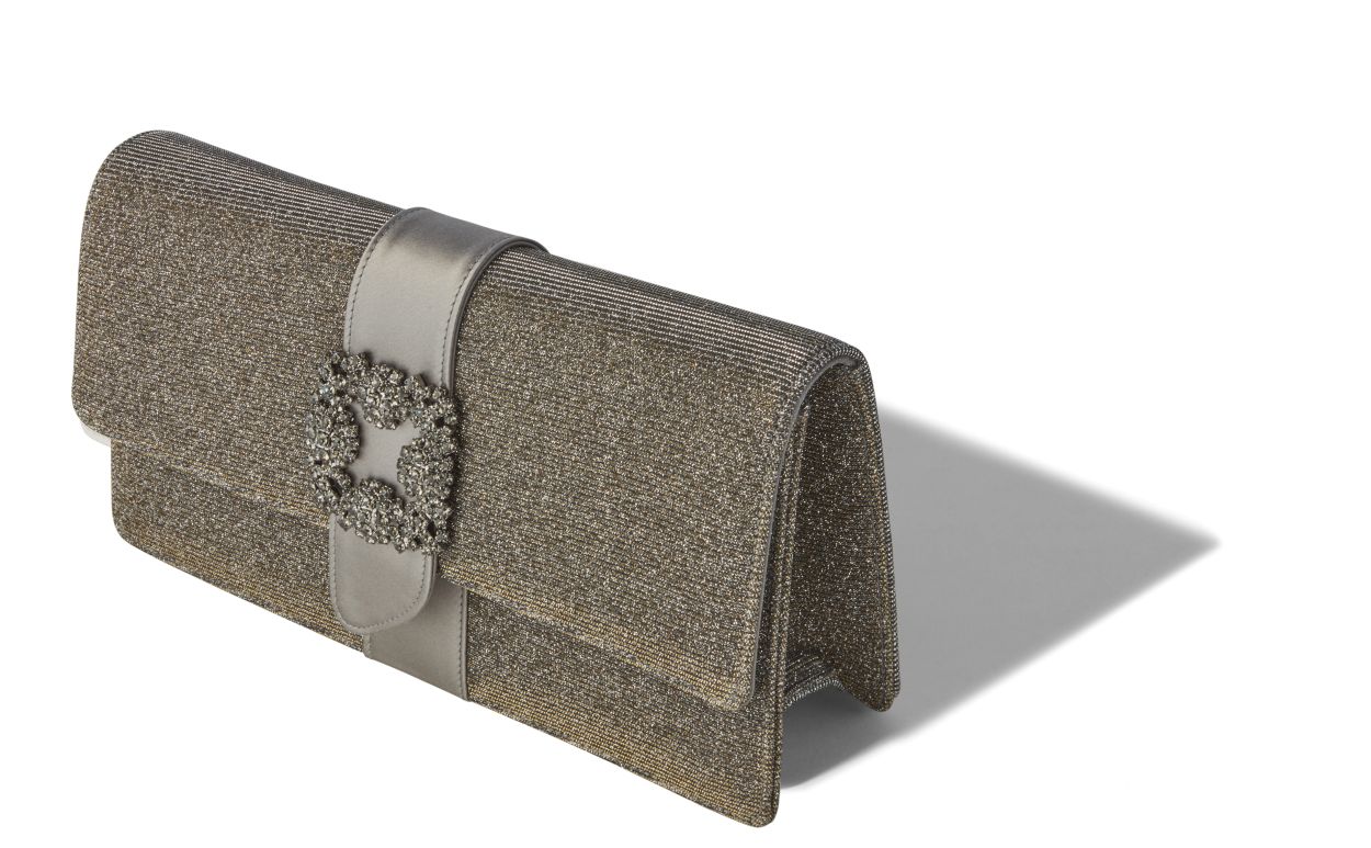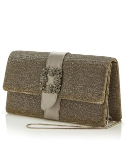Dark gold glitter fabric rectangular clutch bag featuring flap-over design and crystal buckle. Contains internal compartment, mirror and removable chains with two length options. Magnetic closure. Outer: 100% cotton blend fabric. Lining: 68% viscose, 32% silk. Made in Italy. Height: 12 cm Length: 24 cm Width: 6 cm. Straps measure 37 cm and 110 cm.