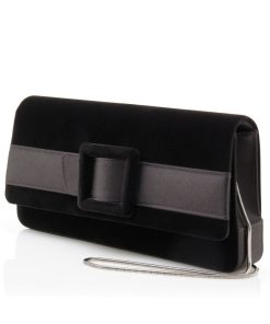 Black velvet rectangular clutch bag featuring flap over detail with magnetic closure and tonal decorative buckle. Contains internal compartment, mirror and removable silver chains in two length options. Upper: 80% velvet, 20% satin. Lining: 100% satin. Made in Italy. Height: 12 cm Length: 24 cm Width: 3 cm. Straps measure 37 cm and 110 cm.
