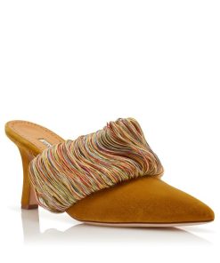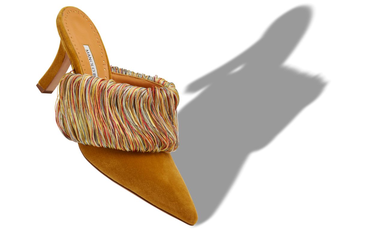 Gold velvet pointed toe mules featuring multicoloured instep fringing details and angular high heel.