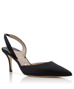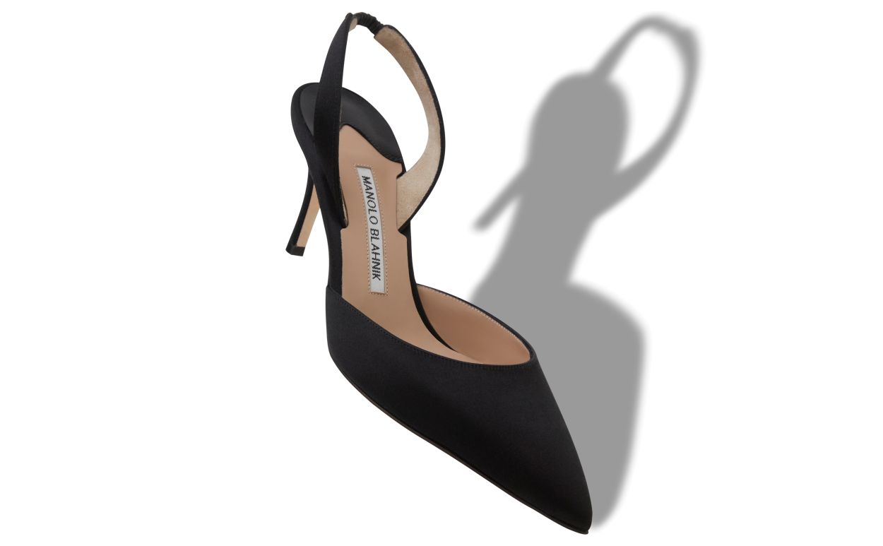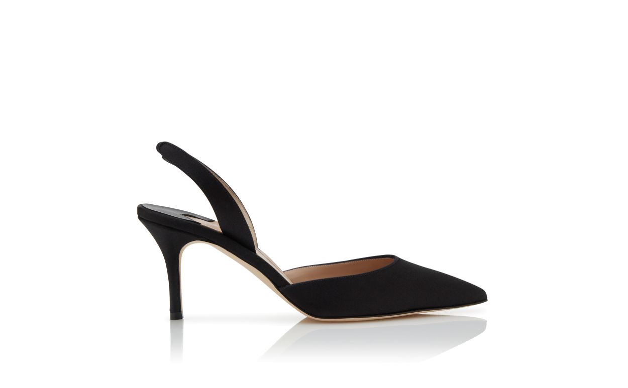 Black satin pointed toe slingback pumps featuring stiletto mid heel. Upper: 98% satin, 2% kid leather. Sole: 100% calf leather. Lining: 100% kid leather. Heel measures 70 mm. Italian sizing. Made in Italy.