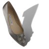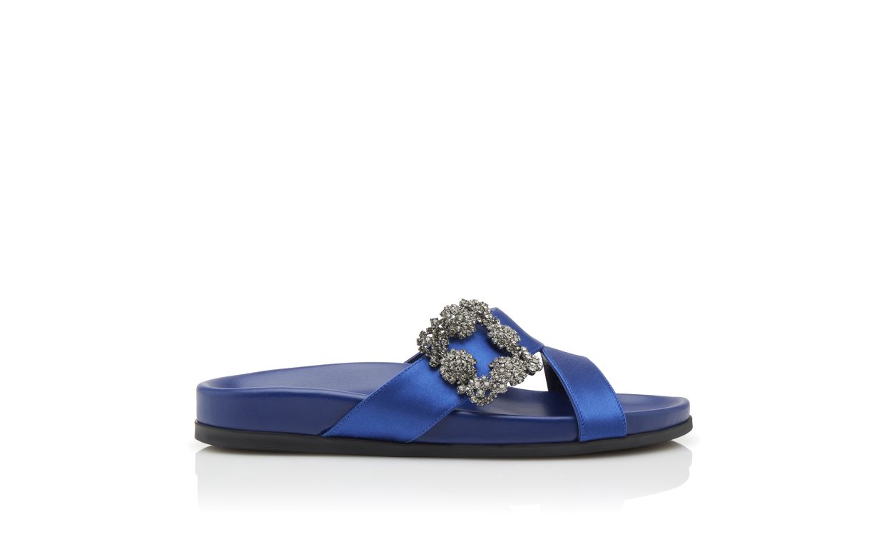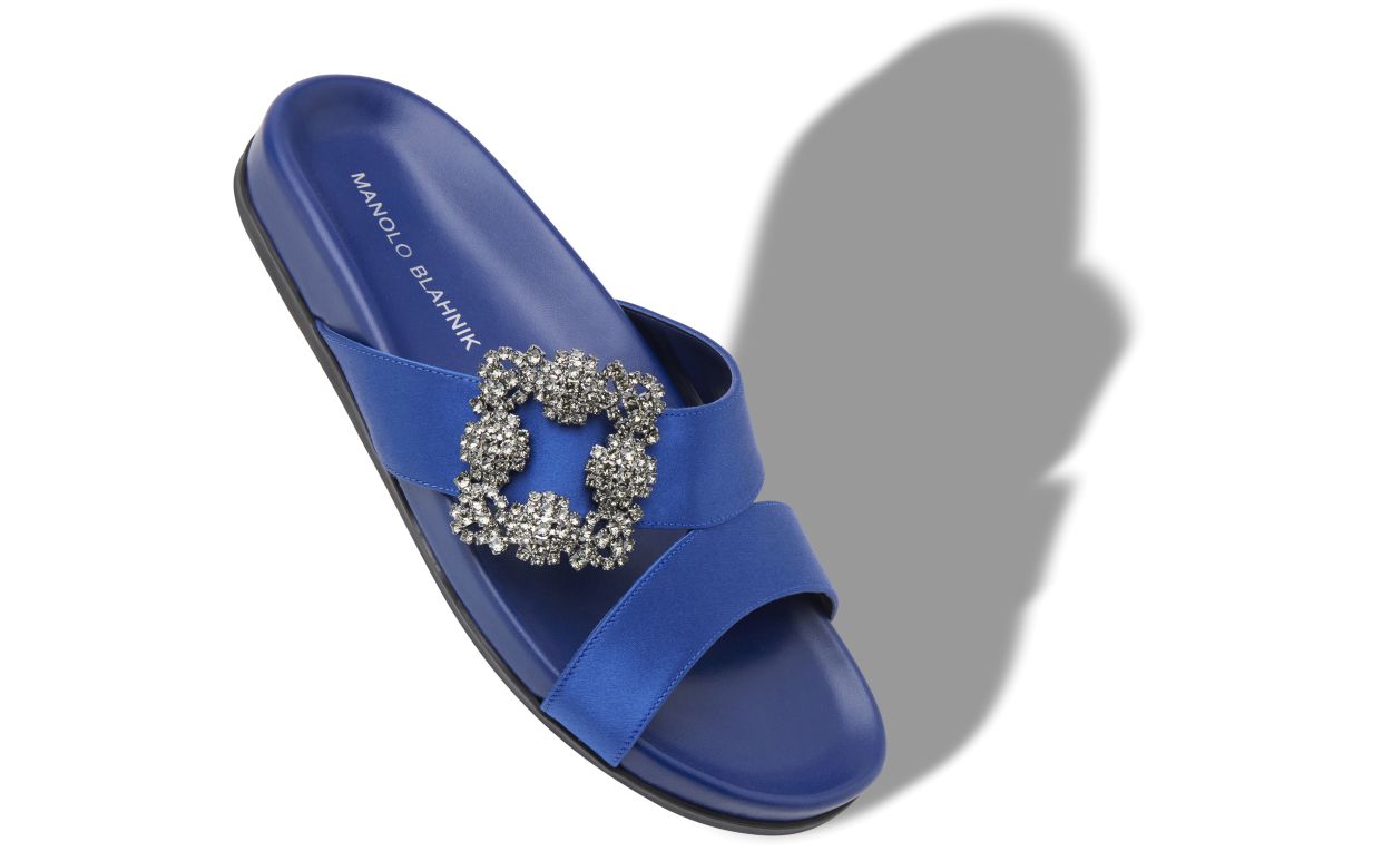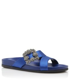 Blue satin open toe flat mules featuring crossover straps with decorative jewel buckle. Finished with flat rubber sole. Upper: 72% viscose, 28% silk. Sole: 100% rubber. Lining: 100% kid leather. Heel measures 10 mm.Italian sizing.Made in Italy.