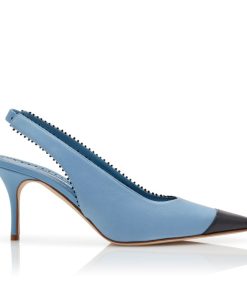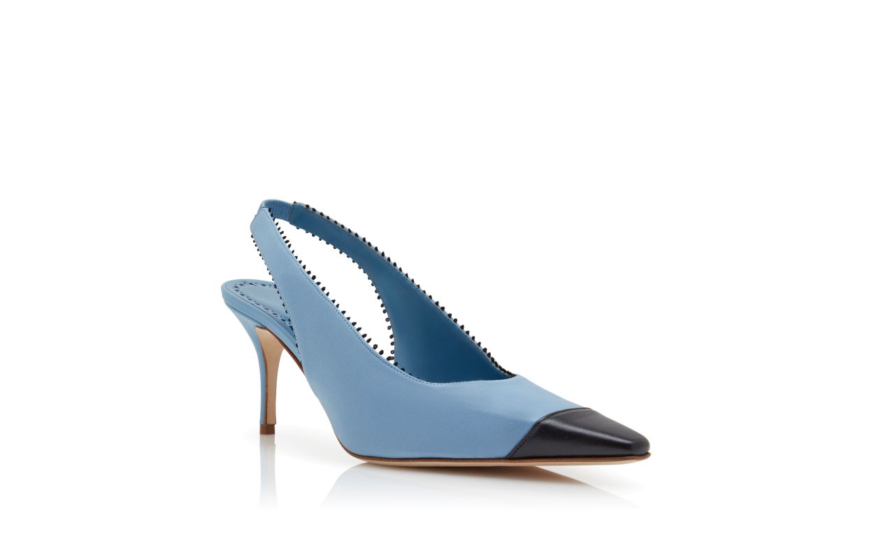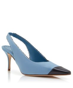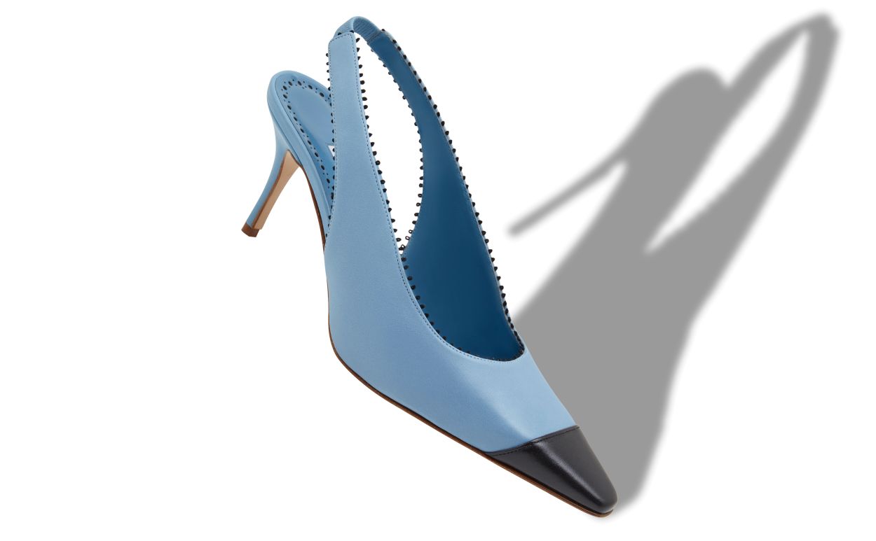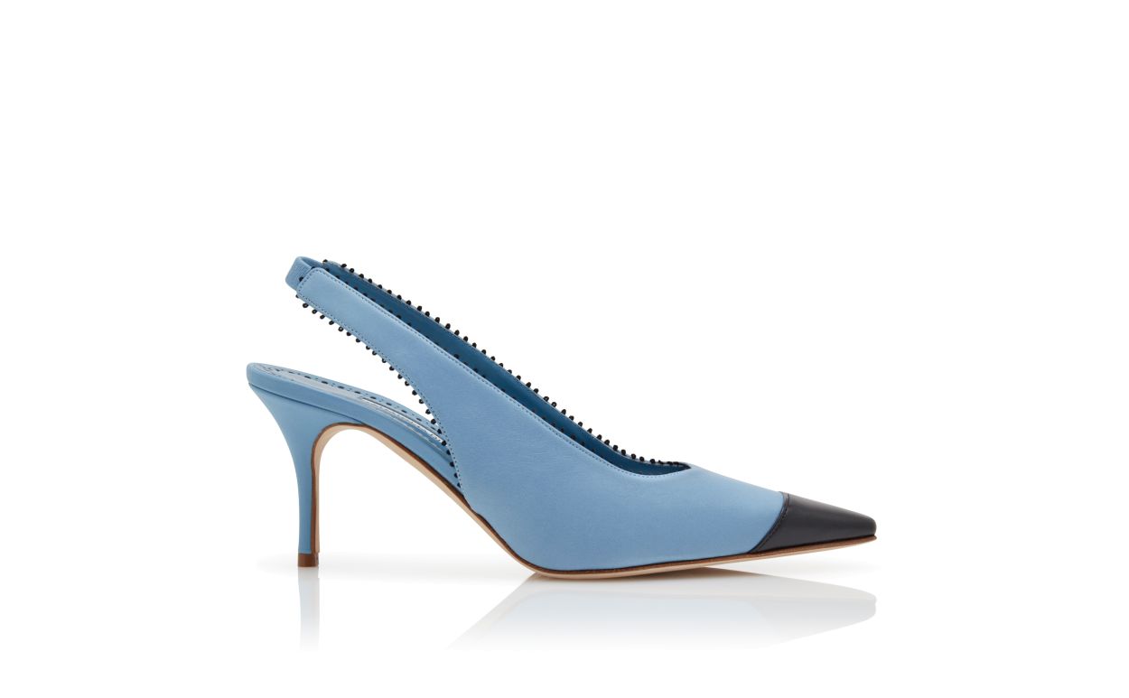 Light blue nappa leather pointed toe pumps featuring black toe cap and pinking details. Finished with elasticated slingback design and stiletto mid heel.Upper: 100% lamb nappa. Sole: 100% calf leather. Lining: 100% kid leather. Heel measures 70 mm. Italian sizing. Made in Italy.