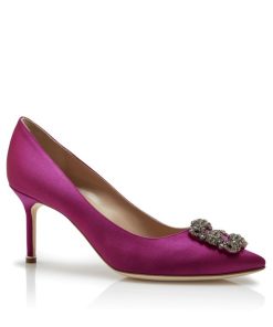 Dark fuchsia satin almond toe pumps featuring a square crystal buckle encased in a gunmetal frame. Finished with a stiletto mid heel. Upper: 68% viscose, 32% silk.Sole: 100% cow leather. Lining: 100% kid leather. Heel measures 70 mm. Italian sizing. Made in Italy.