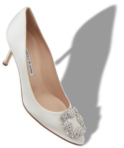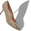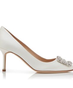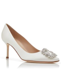 Off-white satin almond toe pumps featuring a square crystal buckle and stiletto mid heel. Upper: 72% viscose, 28% silk. Sole: 100% calf leather. Lining: 100% kid leather. Heel measures 70 mm. Italian sizing. Made in Italy.