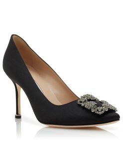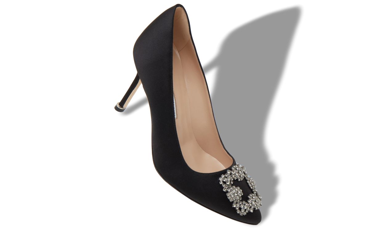 Black satin almond toe pumps featuring a square crystal buckle encased in a gunmetal frame. Finished with a stiletto high heel. Upper: 68% viscose, 32% silk. Sole: 100% cow leather. Lining: 100% goat skin. Heel measures 90 mm. Italian sizing. Made in Italy.