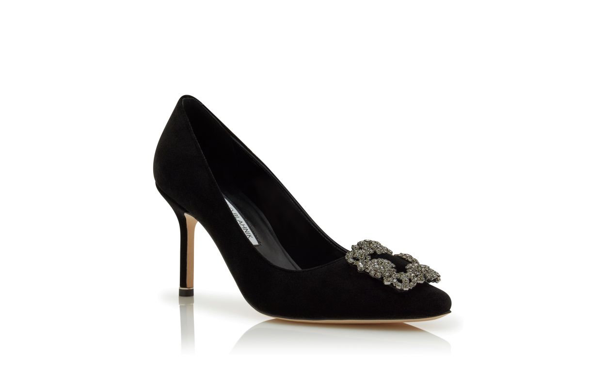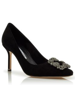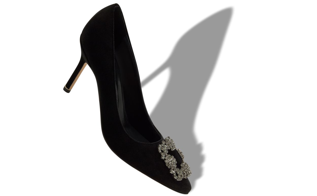 Black velvet almond toe pumps featuring a square crystal buckle encased in a gunmetal frame. Finished with a stiletto high heel. Upper: 100% velvet. Sole: 100% calf leather. Lining: 100% kid leather. Heel measures 90 mm. Italian sizing. Made in Italy.