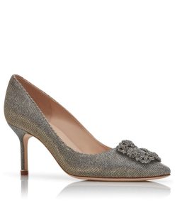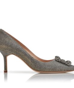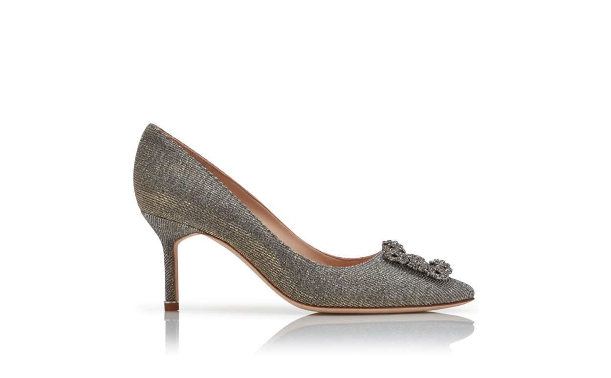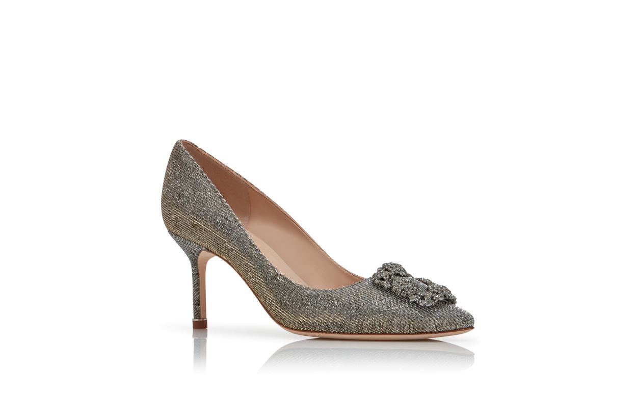 Dark gold glitter fabric almond toe pumps featuring a square crystal buckle encased in a gunmetal frame. Finished with a stiletto mid heel. br/>Upper: 100% polyester. Sole: 100% cow leather. Lining: 100% goat skin. Heel measures 70 mm. Italian sizing. Made in Italy.