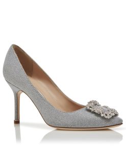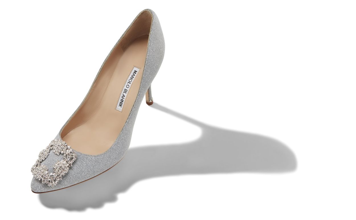 Silver glitter fabric almond toe pumps featuring a clear crystal buckle and stiletto high heel. Upper: 40% cotton, 40% polyester and 20% polyethylene vinyl acetate. Sole: 100% cow leather. Lining: 100% kid leather. Heel measures 90 mm. Made in Italy.
