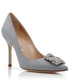 Silver glitter fabric almond toe pumps featuring a clear crystal buckle and stiletto high heel. Upper: 40% polyurethane, 40% polyester, 20% viscose. Sole: 100% cow leather. Lining: 100% kid leather. Heel measures 105 mm. Made in Italy.