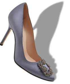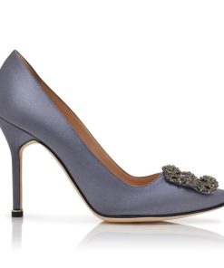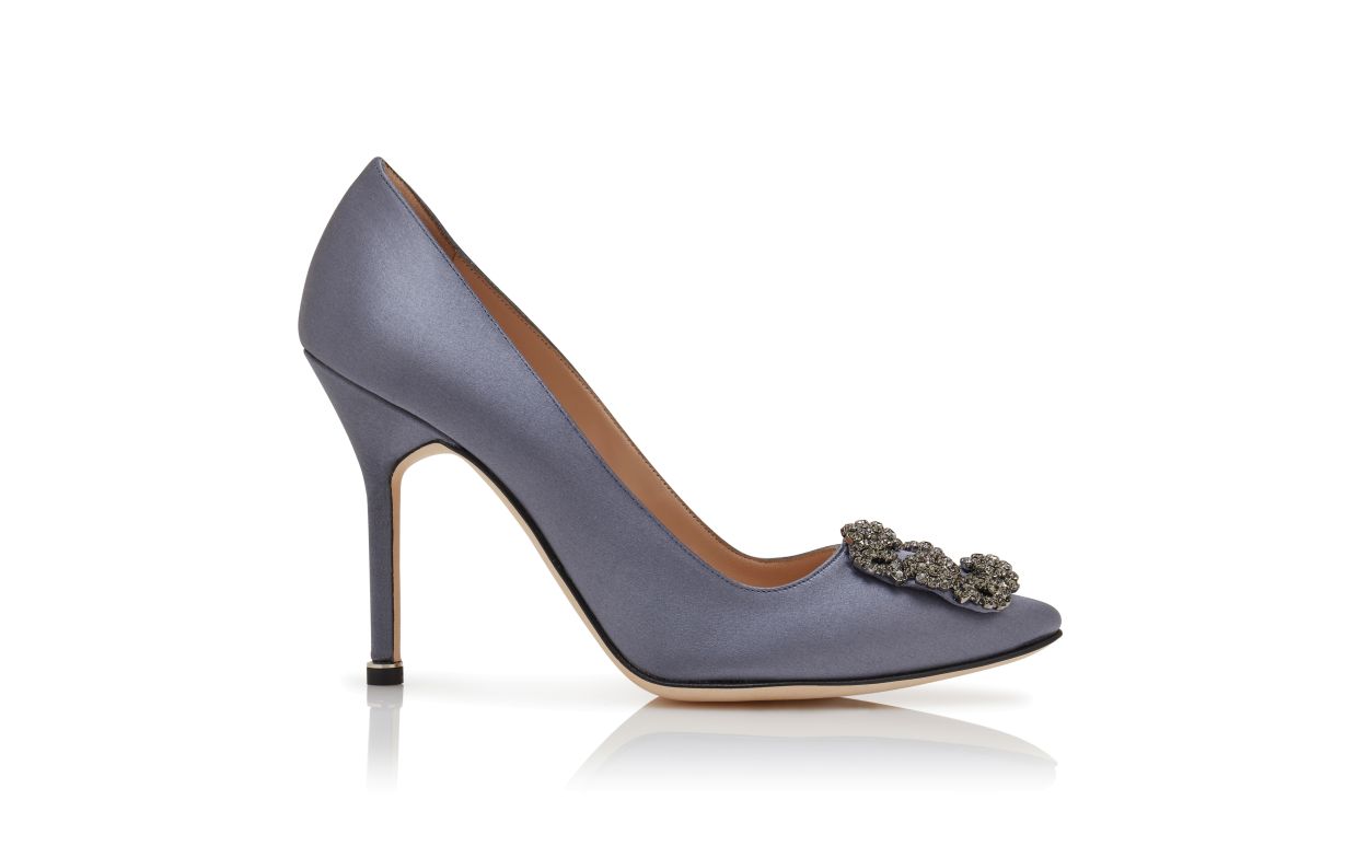 Grey satin almond toe pumps featuring a square crystal buckle encased in a gunmetal frame. Finished with a stiletto high heel. Upper: 68% viscose, 32% silk. Sole: 100% cow leather. Lining: 100% kid leather. Heel measures 105 mm. Italian sizing. Made in Italy.