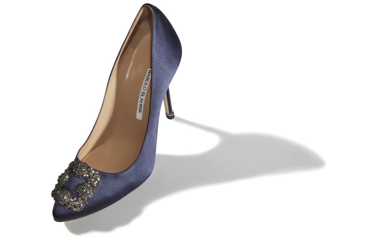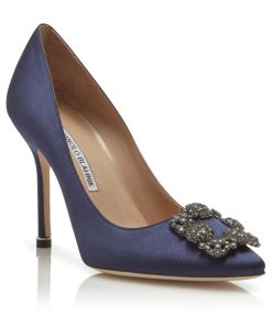 Navy blue satin almond toe pumps featuring a square crystal buckle encased in a gunmetal frame. Finished with a stiletto high heel. Upper: 68% viscose, 32% silk. Sole: 100% cow leather. Lining: 100% kid leather. Heel measures 105 mm. Italian sizing. Made in Italy.
