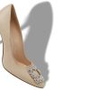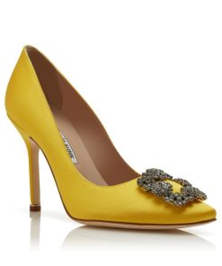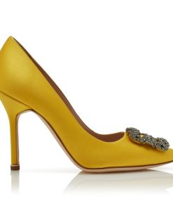 Yellow satin almond toe pumps featuring a square crystal buckle encased in a gunmetal frame. Finished with a stiletto high heel. Upper: 68% viscose, 32% silk. Sole: 100% cow leather. Lining: 100% kid leather. Heel measures 105 mm. Italian sizing. Made in Italy.
