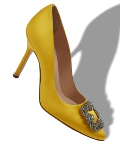 Yellow satin almond toe pumps featuring a square crystal buckle encased in a gunmetal frame. Finished with a stiletto high heel. Upper: 68% viscose, 32% silk. Sole: 100% cow leather. Lining: 100% kid leather. Heel measures 105 mm. Italian sizing. Made in Italy.