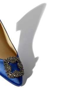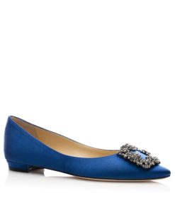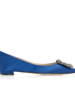 Blue satin almond toe flat pumps finished with a square crystal buckle encased in a gunmetal frame. Upper: 68% viscose, 32% silk. Sole: 100% cow leather. Lining: 100% kid leather. Heel measures 10 mm. Italian sizing. Made in Italy.