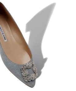 Manolo Blahnik Women’s Style Hangisiflat Glitter | Silver Glitter Fabric Jewel Buckle Flat Pumps