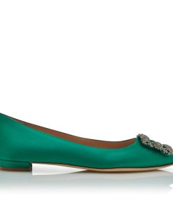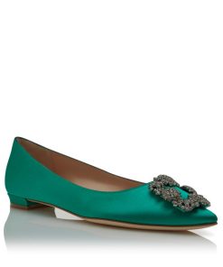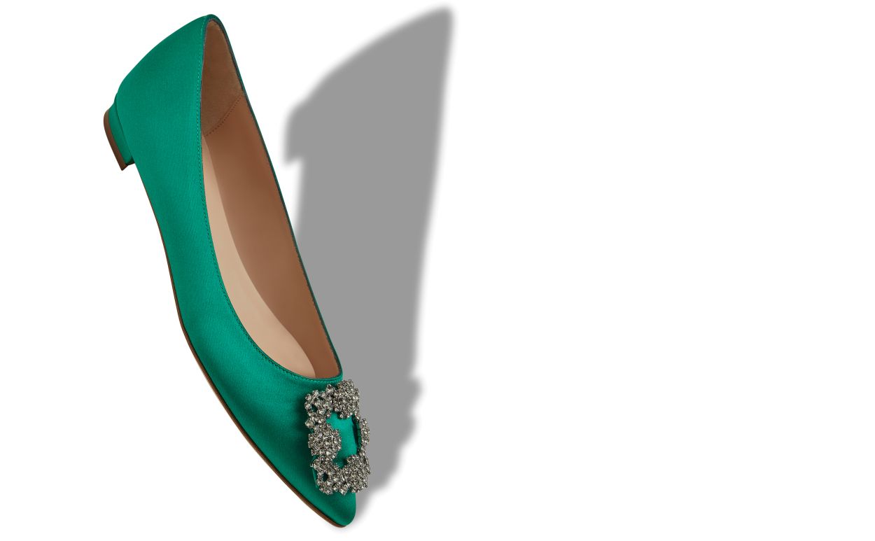 Green satin almond toe flat pumps finished with a square crystal buckle encased in a gunmetal frame. Upper: 68% viscose, 32% silk. Sole: 100% cow leather. Lining: 100% kid leather. Heel measures 10 mm. Italian sizing. Made in Italy.