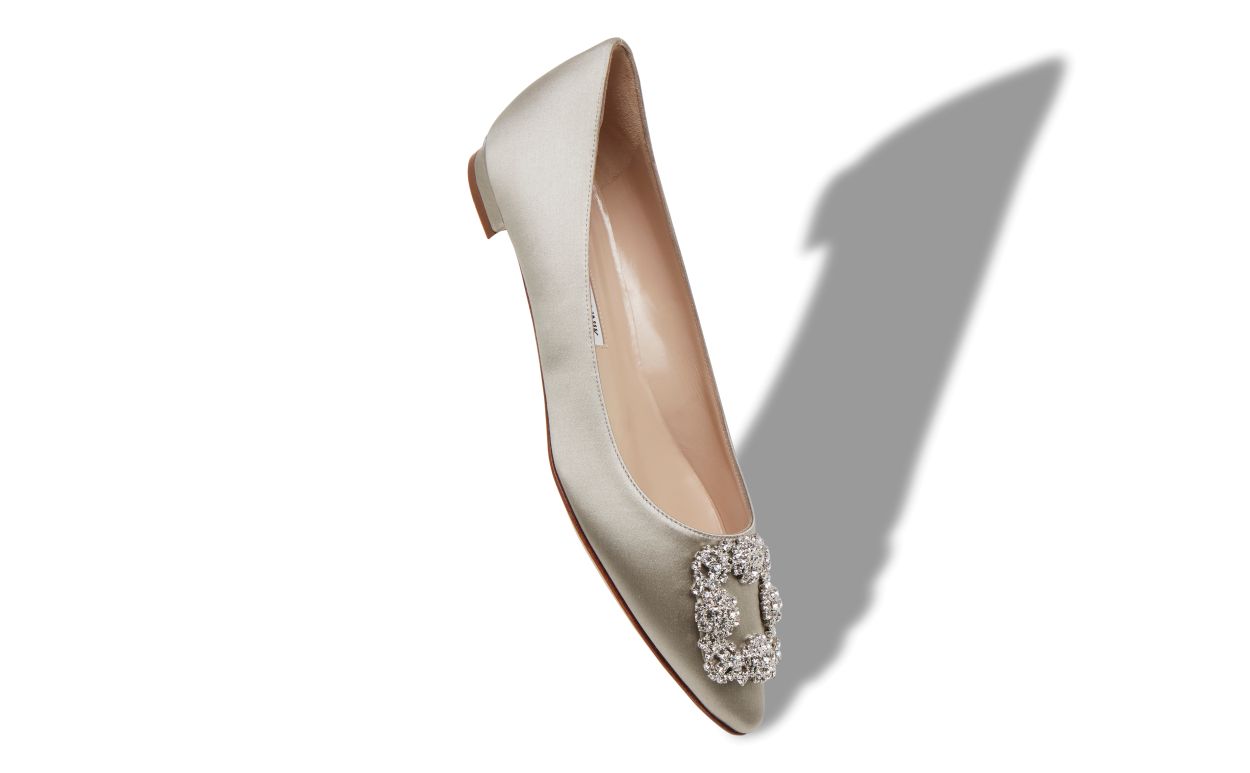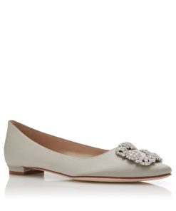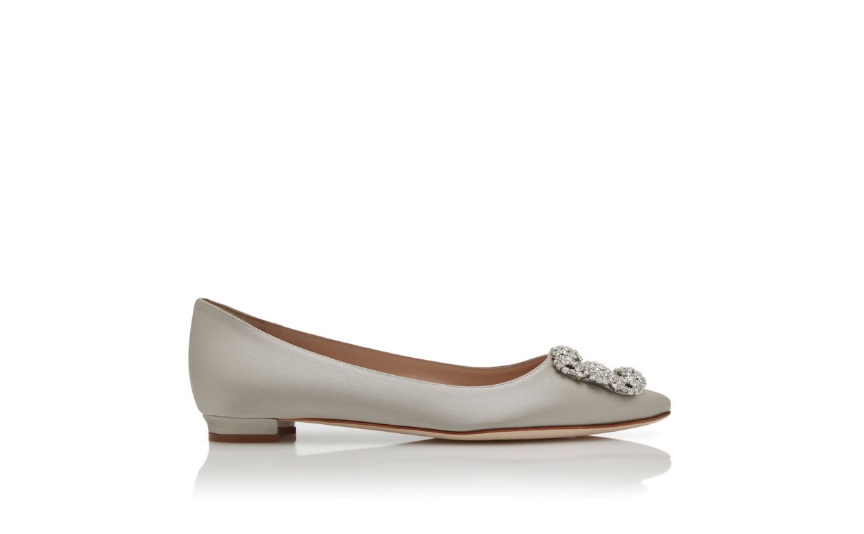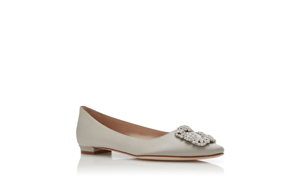 Grey satin almond toe flat pumps featuring square clear crystal buckle and flat stacked heel.Upper: 72% viscose, 28% silk. Sole: 100% calf leather. Lining: 100% kid leather. Heel measures 10 mm. Italian sizing. Made in Italy.