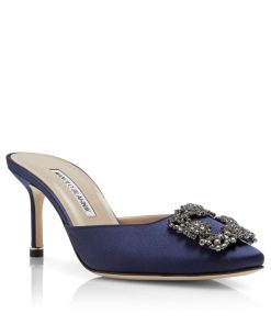 Navy blue satin almond toe mules featuring a square crystal buckle encased in a gunmetal frame. Finished with a stiletto mid heel. Upper: 68% viscose, 32% silk. Sole: 100% cow leather.Lining: 100% kid leather. Heel measures 70 mm. Italian sizing. Made in Italy.