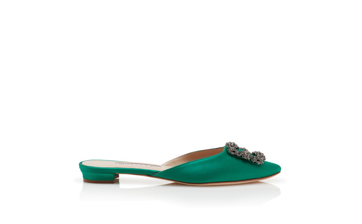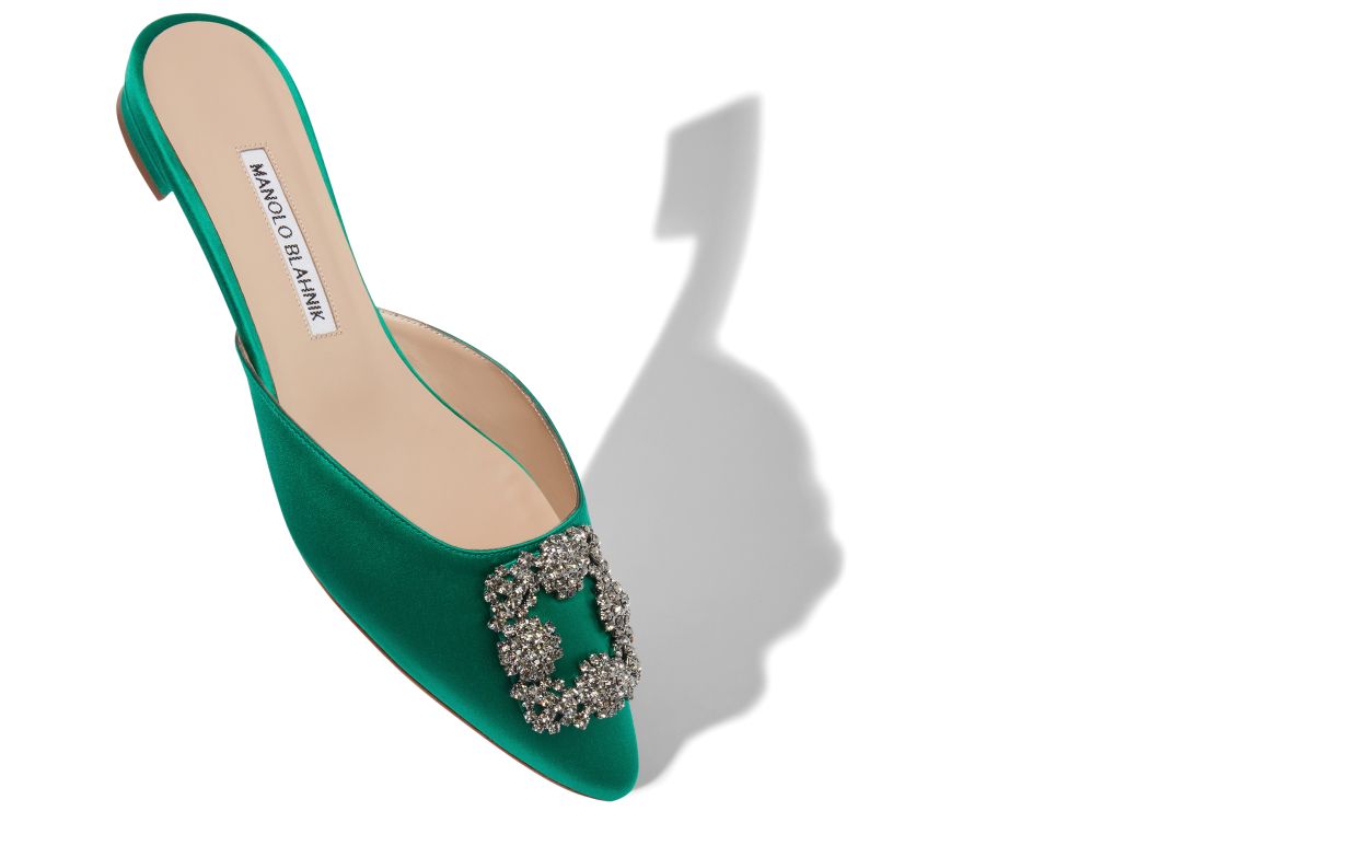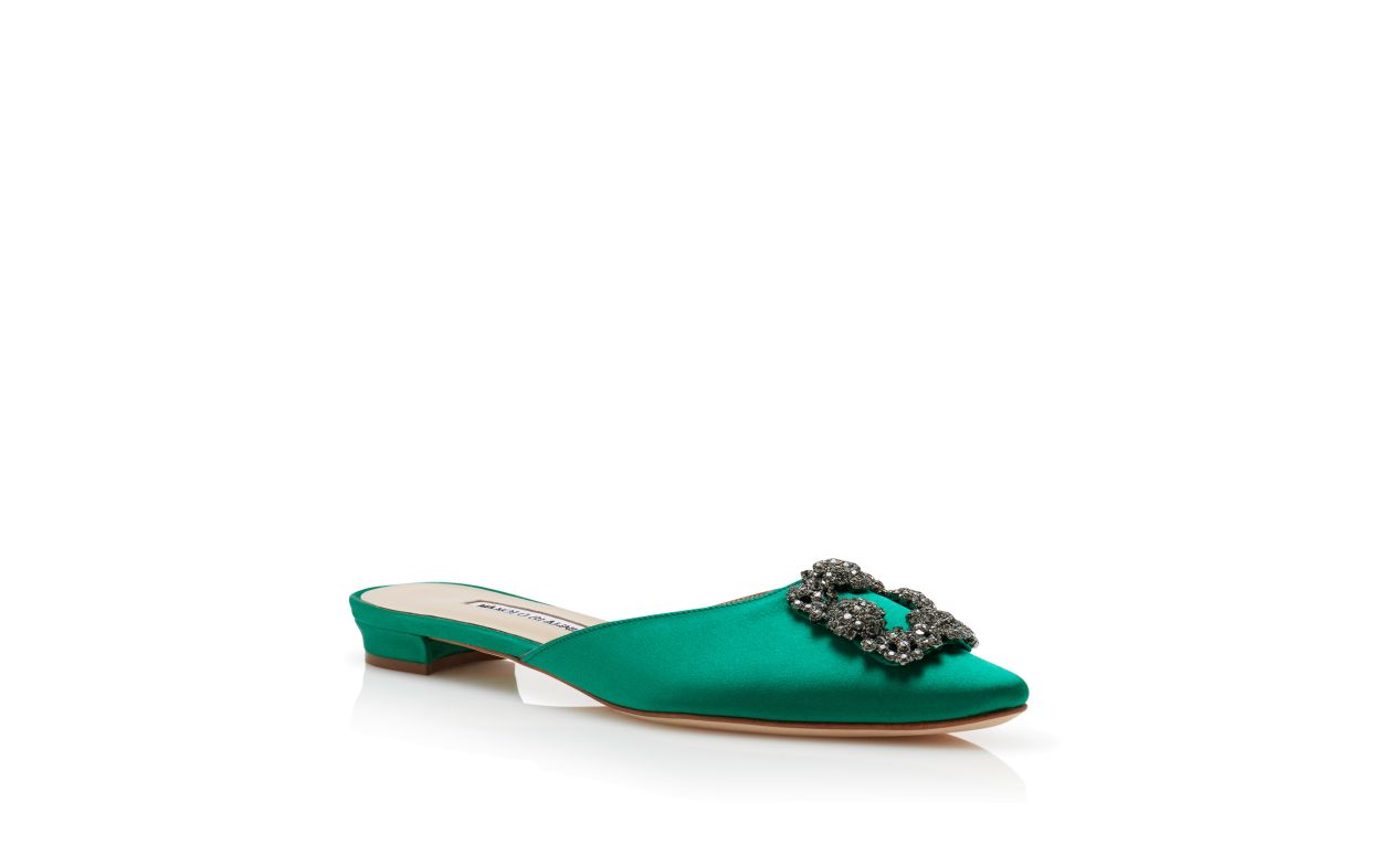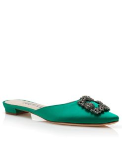 Green satin flat mules finished with a square crystal buckle encased in a gunmetal frame. Upper: 68% viscose, 32% silk. Sole 100% cow leather. Lining 100% kid leather. Heel measures 10 mm. Italian sizing. Made in Italy.