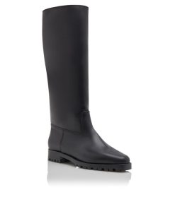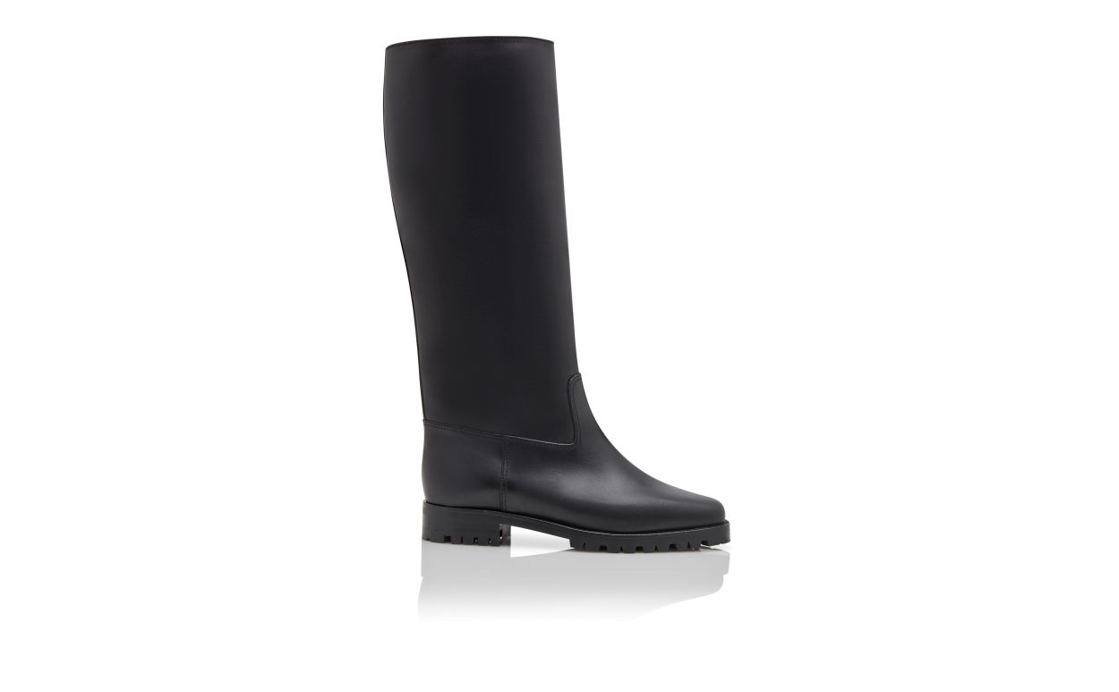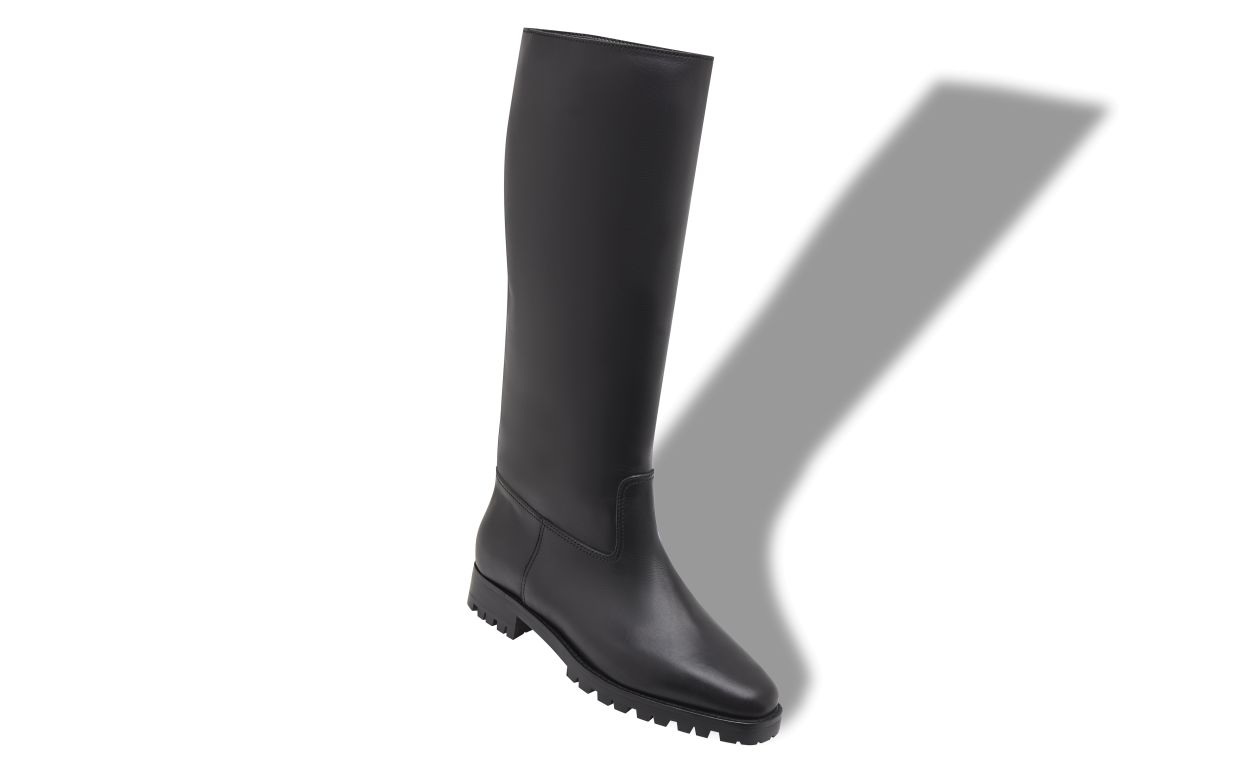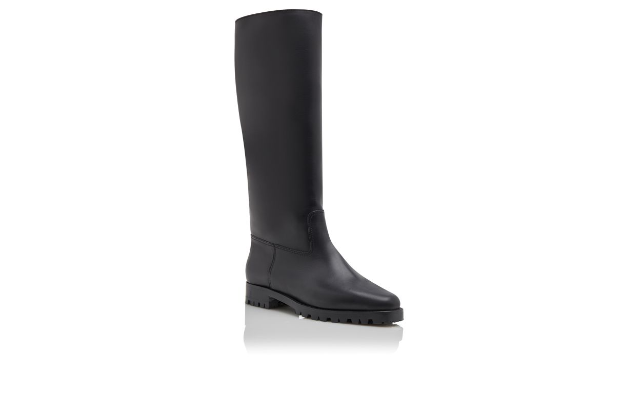 Black calf leather knee high boots featuring slip on design with relaxed fit and rubber sole. Upper: 100% calf leather. Sole: 50% rubber, 50% cow leather. Lining: 100% kid leather. Heel measures 10 mm. Italian sizing. Made in Italy.