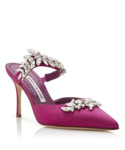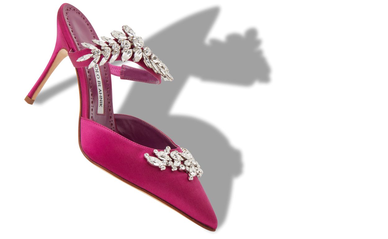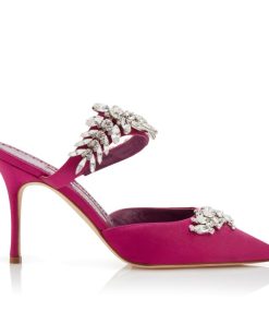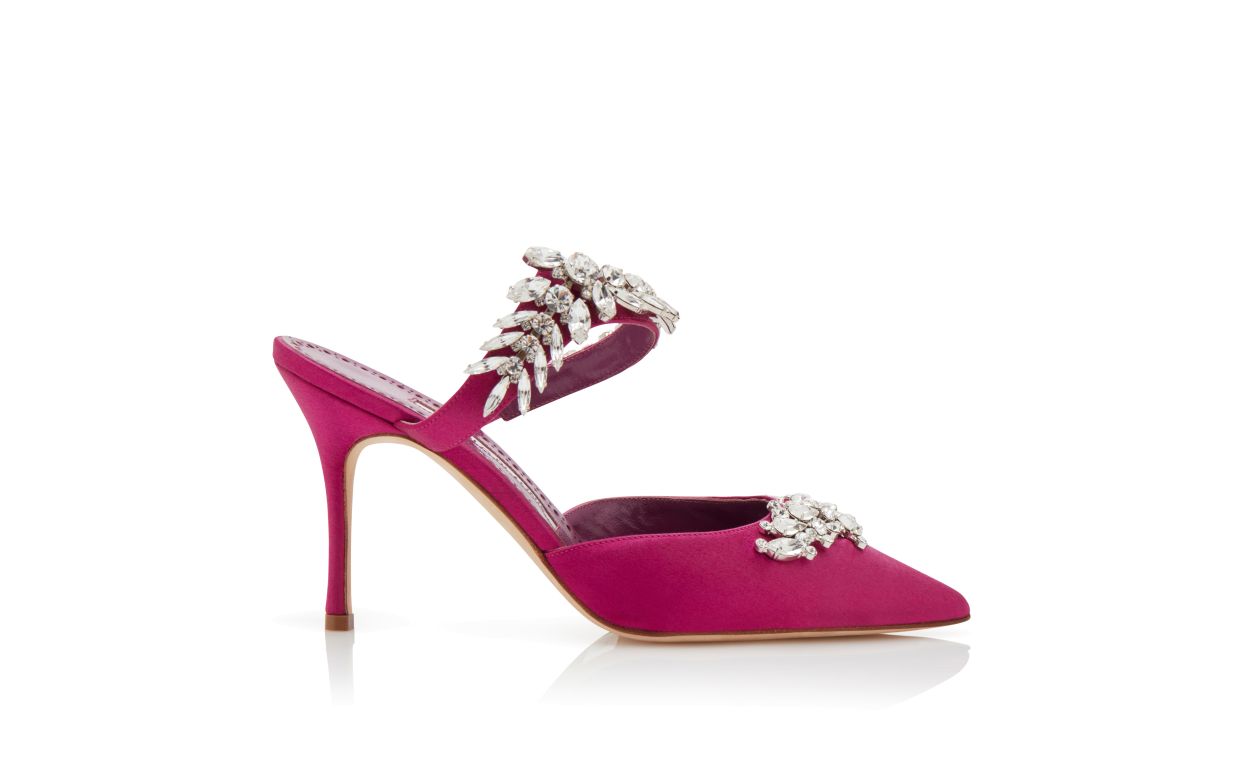 Fuchsia satin mules featuring pointed toe, front strap with crystal embellishment and stiletto high heel. Upper: 72% viscose, 28% silk. Sole: 100% cow leather. Lining: 100% goat skin. Heel measures 90 mm. Made in Italy.