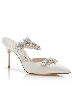 Off-white satin mules featuring pointed toe, front strap with crystal embellishment and stiletto high heel. Upper: 68% viscose, 32% silk. Sole: 100% cow leather. Lining: 100% goat skin. Heel measures 90 mm. Made in Italy.