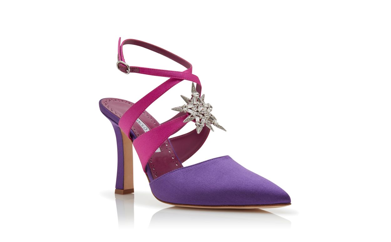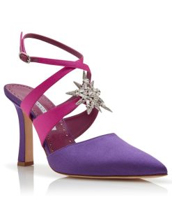 Purple satin pointed toe pumps featuring instep strap with crystal star embellishment, crossover ankle strap and angular high heel.