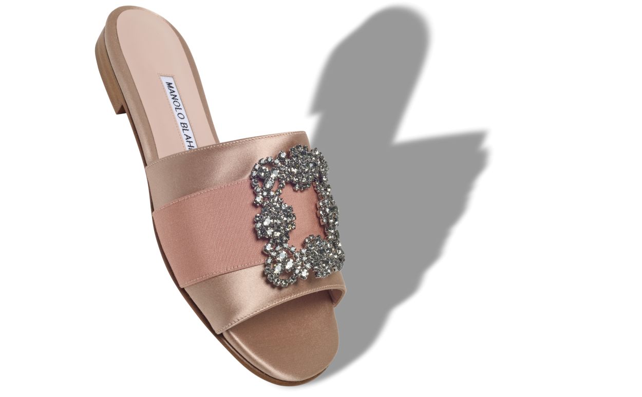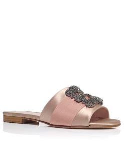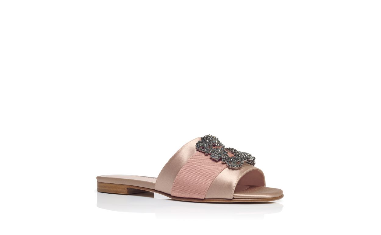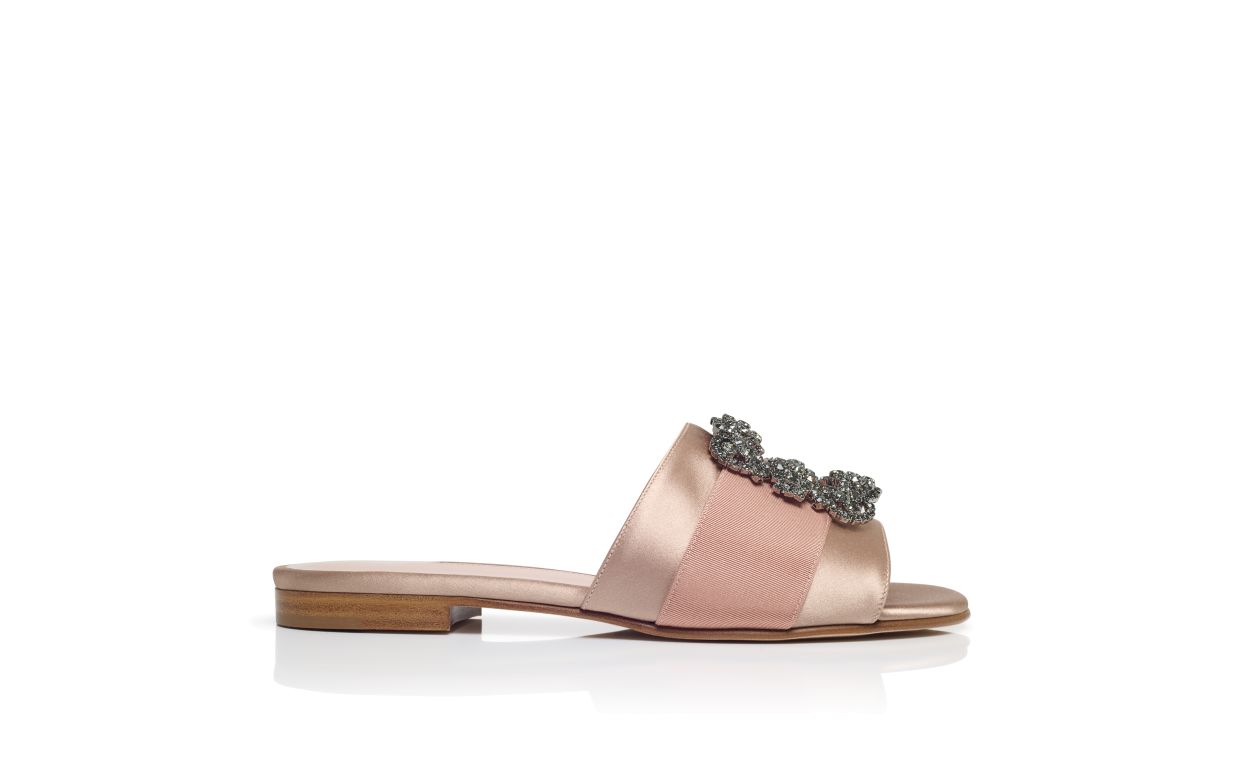 Beige satin flat sandals featuring grosgrain trim, square crystal buckle and flat stacked heel. Upper: 68% viscose, 32% silk. Sole: 100% calf leather. Lining: 100% kid leather. Heel measures 10 mm. Made in Italy.