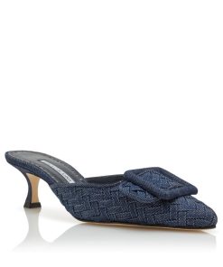 Dark blue chambray pointed toe mules featuring decorative buckle detail, woven design and stiletto low heel.Upper: 100% cotton. Sole: 100% calf leather. Lining: 100% kid leather. Heel measures 50 mm. Italian sizing. Made in Italy.