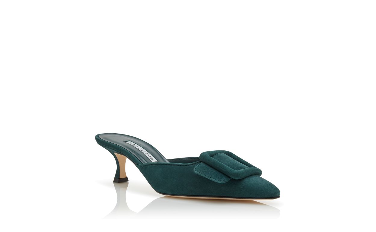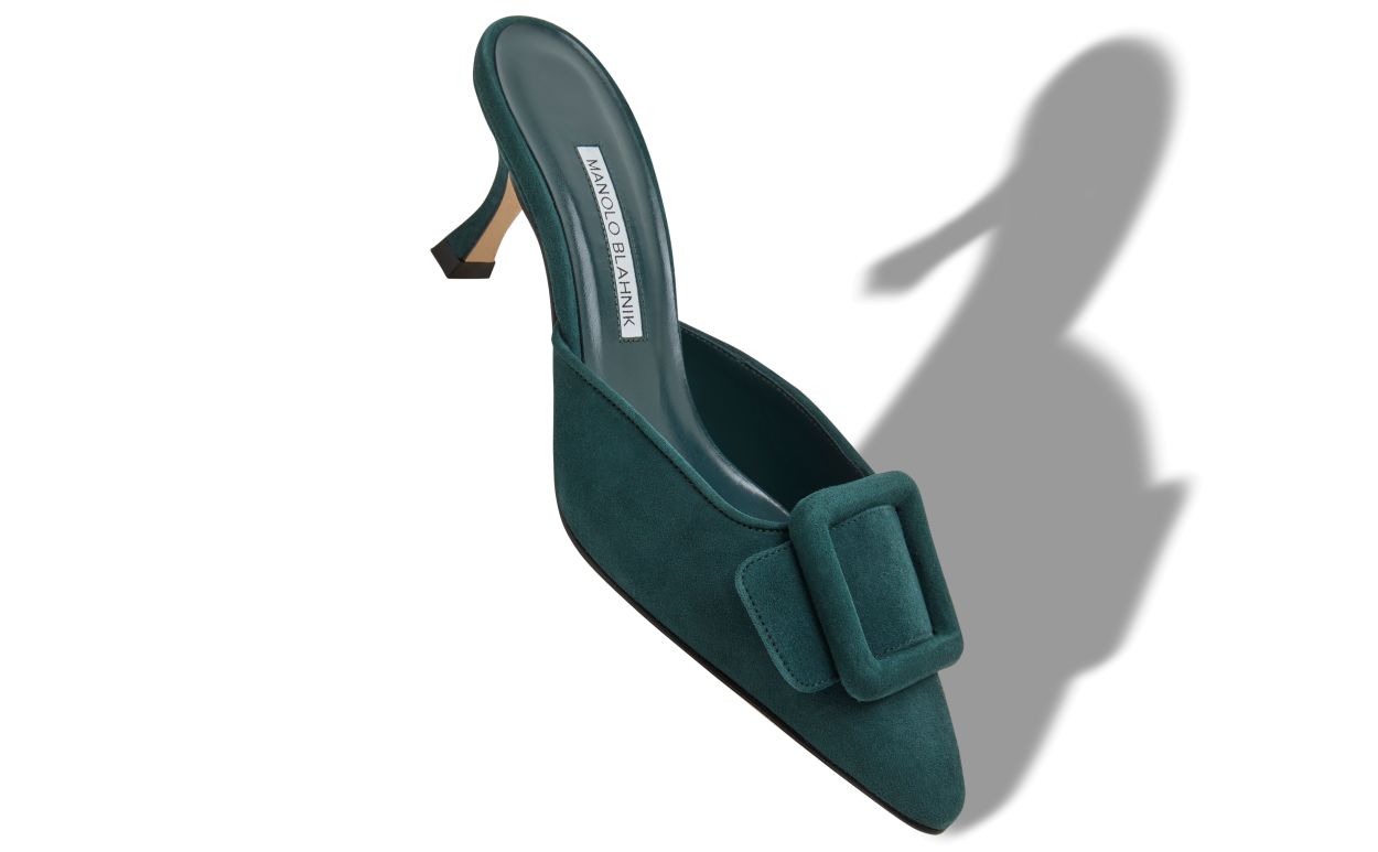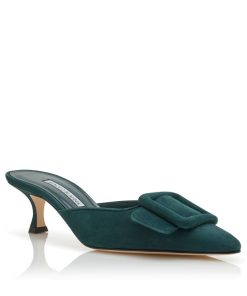 Dark green suede pointed toe mules featuring decorative buckle detail and stiletto low heel.
