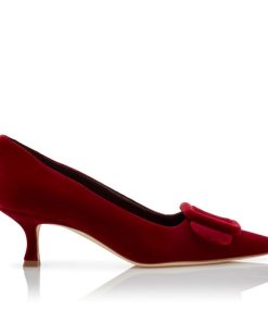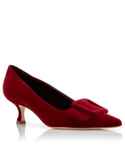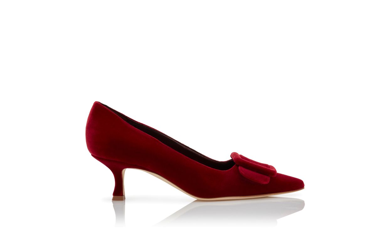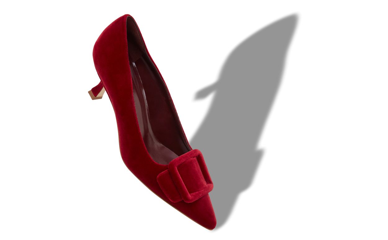 Red velvet almond toe pumps featuring decorative buckle detail and stiletto low heel.Upper: 100% velvet. Sole: 100% calf leather. Lining: 100% kid leather.Heel measures 50 mm.Italian sizing.Made in Italy.