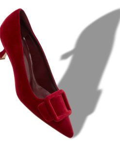 Red velvet almond toe pumps featuring decorative buckle detail and stiletto low heel.Upper: 100% velvet. Sole: 100% calf leather. Lining: 100% kid leather.Heel measures 50 mm.Italian sizing.Made in Italy.